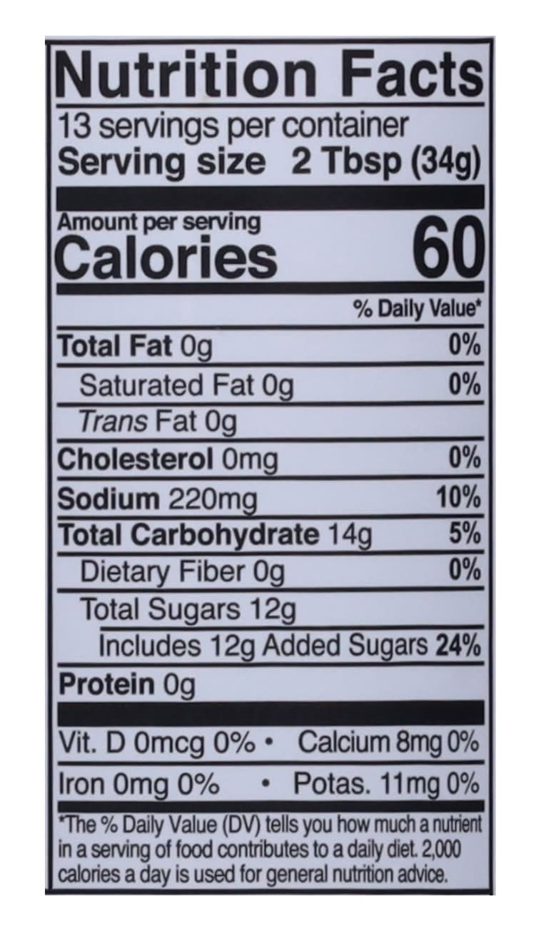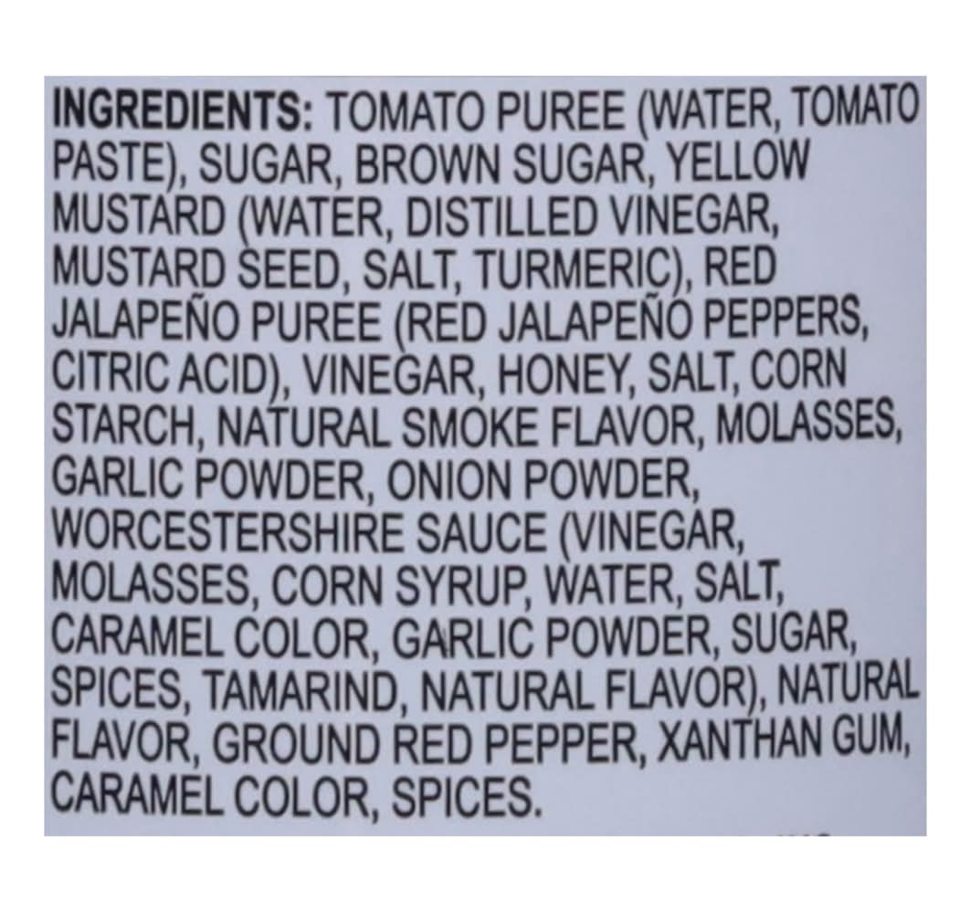 Ingredients: Tomato Puree (Water, Tomato Paste), Sugar, Brown Sugar, Yellow Mustard (Water, Distilled Vinegar, Mustard Seed, Salt, Turmeric), Red Jalapeno Puree (Red Jalapeno Peppers, Citric Acid), Vinegar, Honey, Salt, Corn Starch, Natural Smoke Flavor, Molasses, Garlic Powder, Onion Powder, Worcestershire Sauce (Vinegar, Molasses, Corn Syrup, Water, Salt, Caramel Color, Garlic Powder, Sugar, Spices, Tamarind, Natural Flavor), Natural Flavor, Ground Red Pepper, Xanthan Gum, Caramel Color, Spices Contains: Mustard