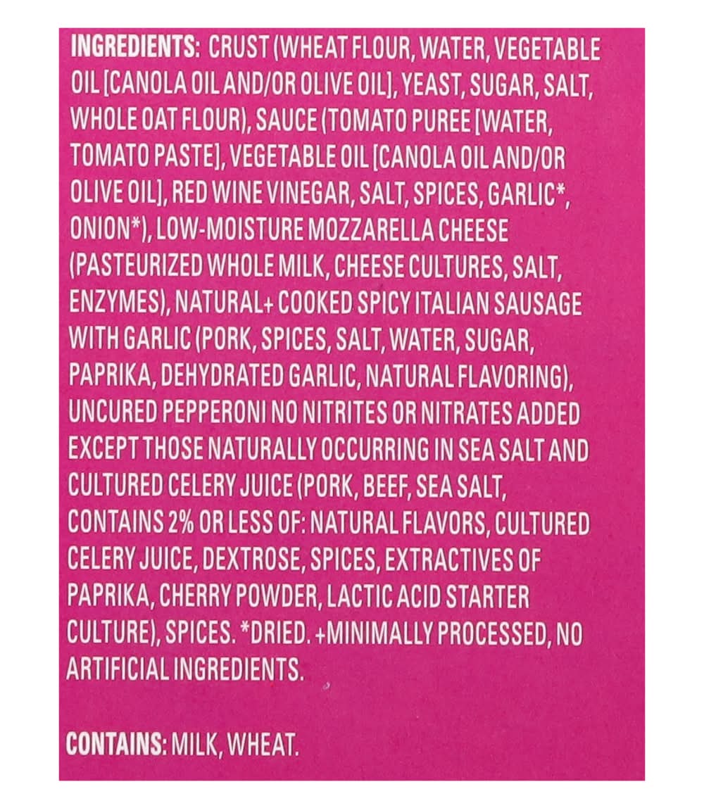 Ingredients: Crust (Wheat Flour, Water, Vegetable Oil [Canola Oil and/or Olive Oil], Yeast, Sugar, Salt, Whole Oat Flour), Sauce (Tomato Puree [Water, Tomato Paste], Vegetable Oil [Canola Oil and/or Olive Oil], Red Wine Vinegar, Salt, Spices, Garlic*, Onion*), Low-Moisture Mozzarella Cheese (Pasteurized Whole Milk, Cheese Cultures, Salt, Enzymes), Natural(a) Cooked Spicy Italian Sausage with Garlic (Pork, Spices, Salt, Water, Sugar, Paprika, Dehydrated Garlic, Natural Flavoring), Uncured Pepperoni No Nitrites or Nitrates Added Except Those Naturally Occurring in Sea Salt and Cultured Celery Juice (Pork, Beef, Sea Salt, Contains 2% or Less of: Natural Flavors, Cultured Celery Juice, Dextrose, Spices, Extractives of Paprika, Cherry Powder, Lactic Acid Starter Culture), Spices. * Dried. (a) Minimally Processed, No Artificial Ingredients Contains: Wheat, Oat, Milk, Celery