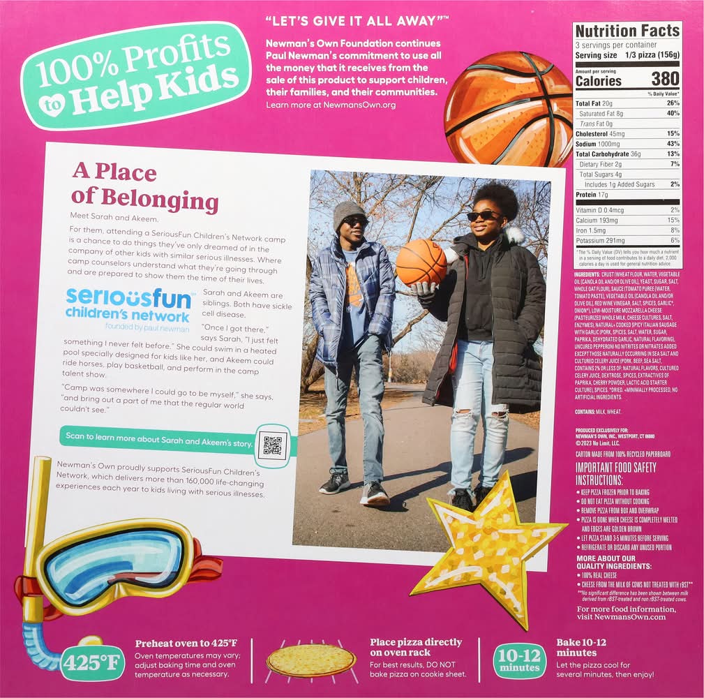 Directions for use: Cook thoroughly. Baking directions on back. Important Food Safety Instructions: Keep pizza frozen prior to baking. Do not eat pizza without cooking. Remove pizza from box, over-wrap and cardboard. Pizza is done when cheese is completely melted and edges are golden brown. Let pizza stand 3-5 minutes before serving. Refrigerate or discard any unused portion. Preheat oven to 425 degrees F: Oven temperatures may vary; adjust baking time and oven temperature as necessary. Place pizza directly on oven rack: For best results, do not bake pizza on cookie sheet. Bake 10-12 minutes: Let the pizza cool for several minutes, then enjoy! Keep frozen. Pull tab to open. Storage recommendation: Keep frozen.