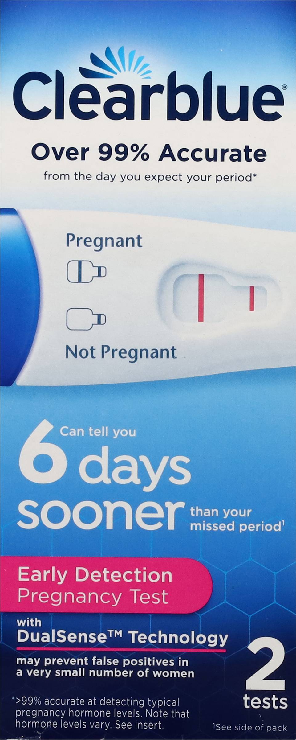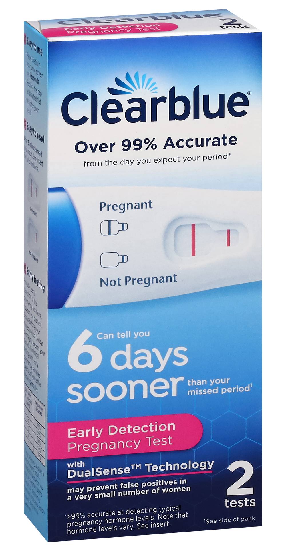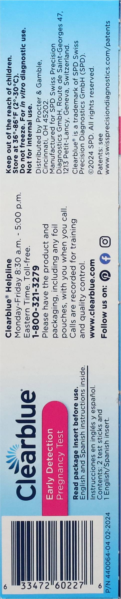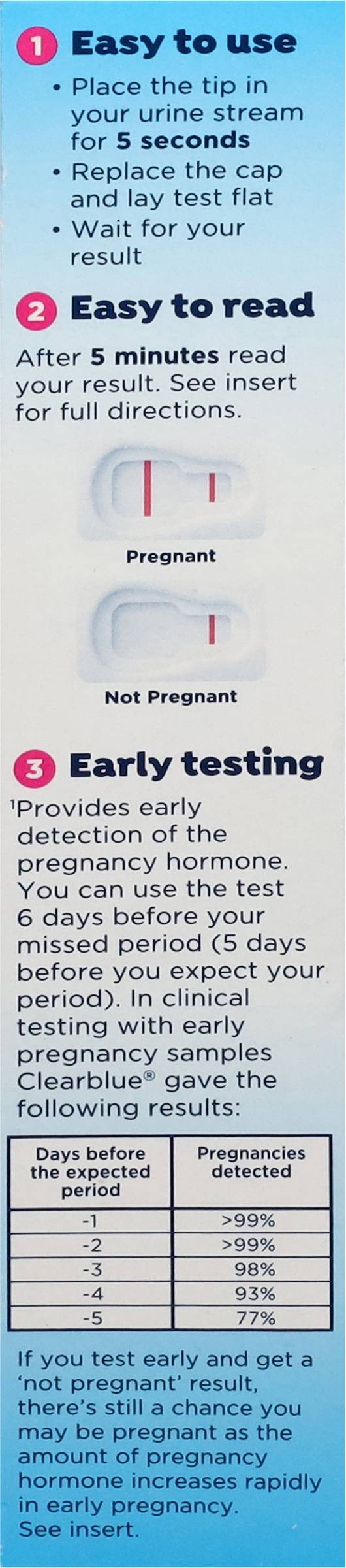 Directions for use: 1. Easy to use: Place tip in your urine stream for 5 seconds. Replace the cap and lay test flat. Wait for your result. 2. Easy to read: After 5 minutes read your result. See insert for full directions. 3. Provides early detection of the pregnancy hormone. You can use the test 6 days before your missed period (5 days before you expect your period). In clinical testing with early pregnancy samples Clearblue gave the following results: Days before the expected period: -1; greater than 99% pregnancies detected. Days of before the expected period: -2; greater than 99% pregnancies detected. Days before the expected period: -3; 98% pregnancies detected. Days before the expected period: -4; 93% pregnancies detected. Days before the expected period; 77% pregnancies detected. If you test early and get a not pregnant result, there's still a chance you may be pregnant as the amount of pregnancy hormone increases rapidly in early pregnancy. See insert. Read package insert before use. English and Spanish instructions inside. - Directions: 1. Easy to use: Place tip in your urine stream for 5 seconds. Replace the cap and lay test flat. Wait for your result. 2. Easy to read: After 5 minutes read your result. See insert for full directions. 3. Provides early detection of the pregnancy hormone. You can use the test 6 days before your missed period (5 days before you expect your period). In clinical testing with early pregnancy samples Clearblue gave the following results: Days before the expected period: -1; greater than 99% pregnancies detected. Days of before the expected period: -2; greater than 99% pregnancies detected. Days before the expected period: -3; 98% pregnancies detected. Days before the expected period: -4; 93% pregnancies detected. Days before the expected period; 77% pregnancies detected. If you test early and get a not pregnant result, there's still a chance you may be pregnant as the amount of pregnancy hormone increases rapidly in early pregnancy. See insert. Read package insert before use. English and Spanish instructions inside. Store at 36 degrees - 86 degrees F (2 degrees - 30 degrees C). Do not freeze. Storage recommendation: Store at 36 degrees - 86 degrees F (2 degrees - 30 degrees C). Do not freeze.