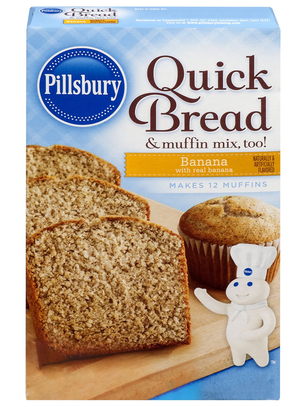 Pillsbury Quick Bread & Muffin Mix offers a blend of natural and artificial banana flavors. Each half-package serving contains 100 calories, no saturated fat, 160 milligrams of sodium, and 11 grams of sugar. The mix includes bioengineered food ingredients and can be used to prepare either quick bread or muffins, featuring real banana flavor. For full nutritional details, consumers should refer to the information provided for the prepared product. • Flavor: Banana • Hometown Food Company, 500 W. Madison, Chicago, IL, 60661 • Packaging: Reusable