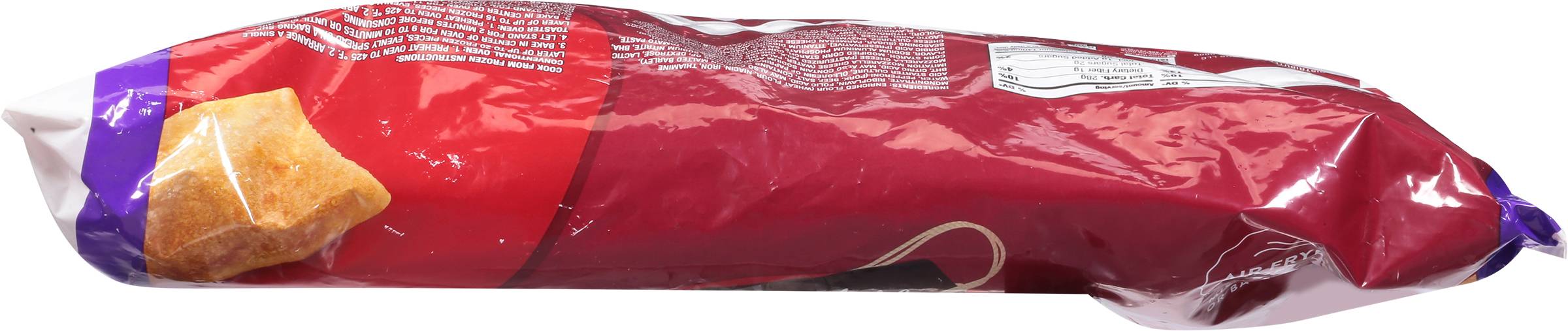 Directions for use: Directions: Cook thoroughly. Cook from Frozen Instructions: Conventional Oven: 1. Preheat oven to 425 degrees F. 2. Arrange a single layer of up to 20 frozen pieces, evenly spread on a baking sheet. 3. Bake in center of oven for 9 to 10 minutes or until sizzling. 4. Let stand for 2 minutes before consuming. Toaster Oven: 1. Preheat oven to 425 degrees F. 2. Arrange a single layer of up to 15 frozen pieces, evenly spread, on a baking sheet. 3. Bake in center of oven for 11-12 minutes or until sizzling. 4. Let stand for 2 minutes before consuming. Microwave Oven (1100W): 1. Place a double-layer of paper towels on a microwave-safe plate. 2. Arrange 6 frozen pieces in a circle on the plate and place plate off-center on the carousel. 3. Heat on high for 65 seconds. If not fully cooked heat in additional 10 second increments. 4. Let stand 2 minutes before consuming. Air Fryer: 1. Preheat air fryer to 400 degrees F. 2. Arrange up to 15 frozen pieces in the air fryer basket, in a single layer. 3. Cook for 5 minutes, shaking basket halfway through cooking time. 4. Let stand 2 minutes before consuming. For food safety and quality follow cooking instructions. Keep product frozen until ready to prepare. Cook thoroughly before eating. Cooking appliances vary in efficiency; time and/or temperature may need adjusting to achieve 165 degrees F internal product temperature as measured by a food thermometer. Refrigerate or discard any leftovers. For best results, conventional or toaster oven instructions are recommended. Internal end temperature: 165 degrees F. Caution: Filling will be very hot after cooking. Perishable - Keep frozen. Pull to open. Storage recommendation: Perishable - Keep frozen.