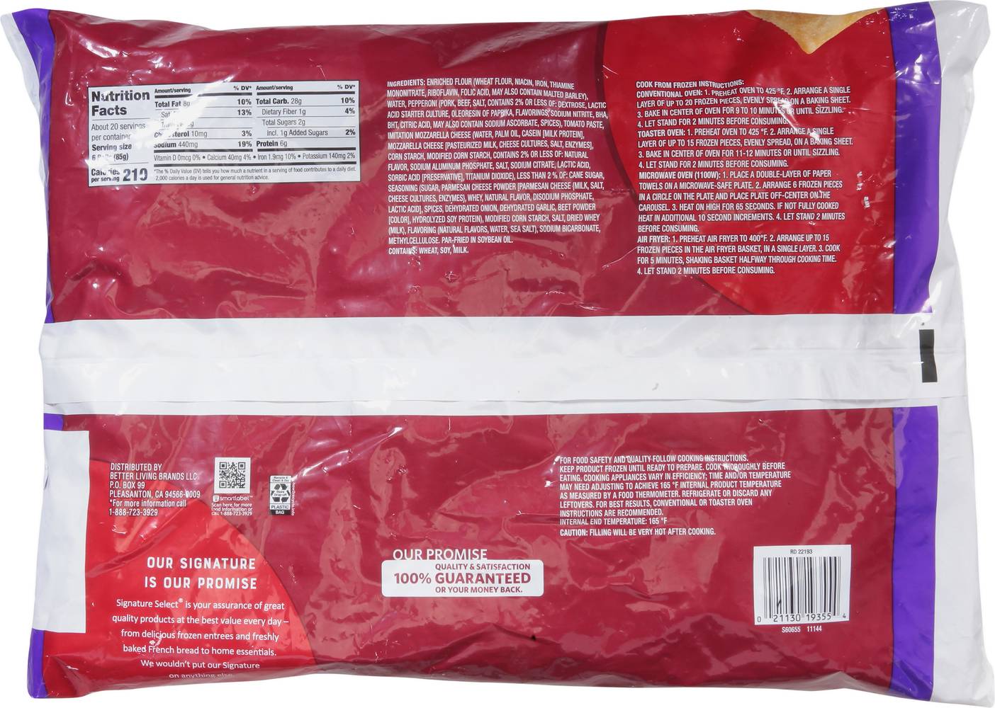 About 120 half ounce pieces. Pepperoni pizza in a golden crust. Air fryer friendly. Microwave or bake me! Microwaveable. Our Signature is our Promise: Signature Select is your assurance of great quality products at the best value every day - from delicious frozen entrees and freshly baked French bread to home essentials. We wouldn't put our Signature on anything else. Quality guaranteed. Our Promise: Quality & satisfaction 100% guaranteed or your money back. U.S. inspected and passed by Department of Agriculture. how2recycle.info. SmartLabel: Scan for more food information or call 1-888-723-3929. For more information call 1-888-723-3929. Resealable bag.