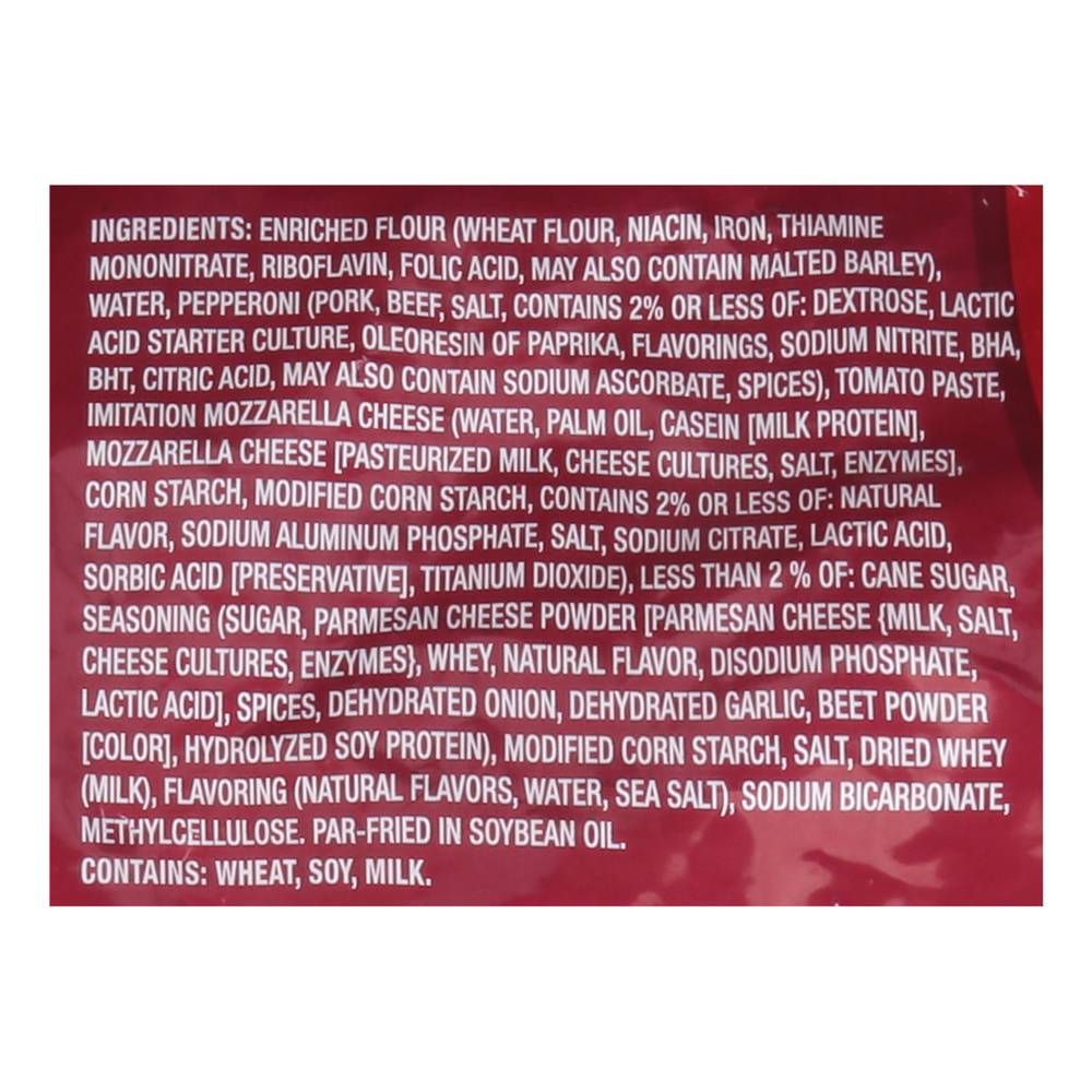 Ingredients: Enriched Flour (Wheat Flour, Niacin, Iron, Thiamine Mononitrate, Riboflavin, Folic Acid, May Also Contain Malted Barley), Water, Pepperoni (Pork, Beef, Salt, Contains 2% or Less of: Dextrose, Lactic Acid Starter Culture, Oleoresin of Paprika, Flavorings, Sodium Nitrite, BHA, BHT, Citric Acid, May Also Contain Sodium Ascorbate, Spices), Tomato Paste, Imitation Mozzarella Cheese (Water, Palm Oil, Casein [Milk Protein], Mozzarella Cheese [Pasteurized Milk, Cheese Cultures, Salt, Enzymes], Corn Starch, Modified Corn Starch, Contains 2% or Less of: Natural Flavor, Sodium Aluminum Phosphate, Salt, Sodium Citrate, Lactic Acid, Sorbic Acid [Preservative], Titanium Dioxide), Less than 2 % of: Cane Sugar, Seasoning (Sugar, Parmesan Cheese Powder [Parmesan Cheese {Milk, Salt, Cheese Cultures, Enzymes}, Whey, Natural Flavor, Disodium Phosphate, Lactic Acid], Spices, Dehydrated Onion, Dehydrated Garlic, Beet Powder [Color], Hydrolyzed Soy Protein), Modified Corn Starch, Salt, Dried Whey (Milk), Flavoring (Natural Flavors, Water, Sea Salt), Sodium Bicarbonate, Methylcellulose. Par-Fried in Soybean Oil. Contains: Wheat, Soybeans, Milk, Corn, Barley