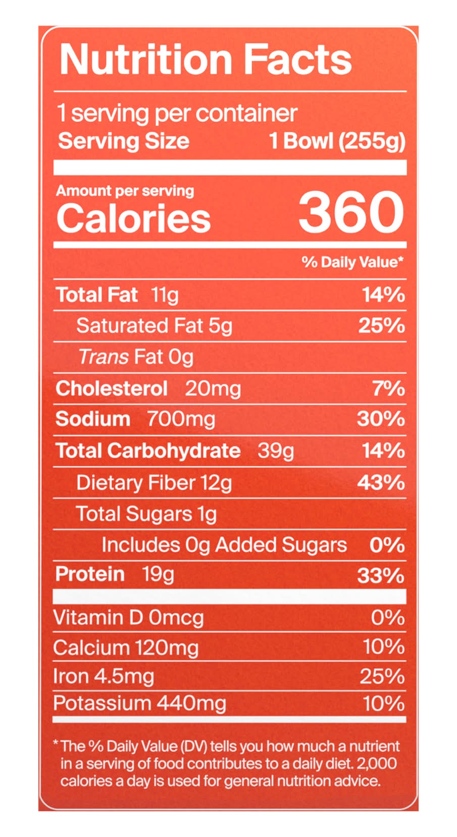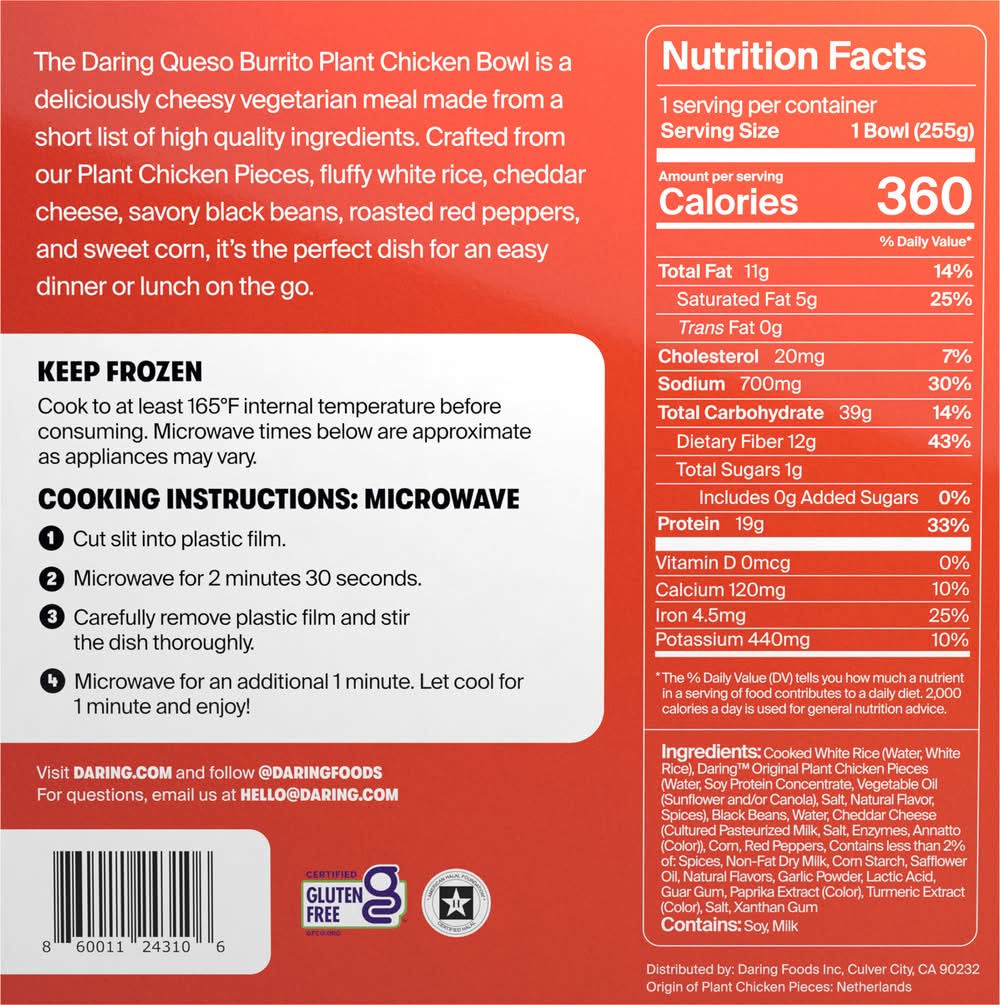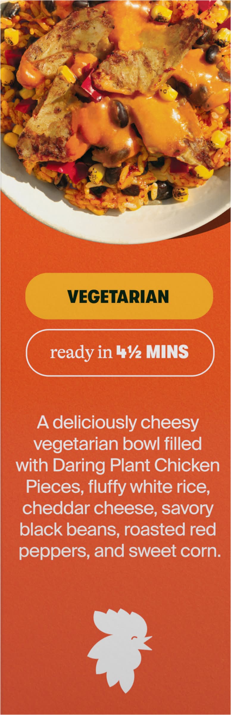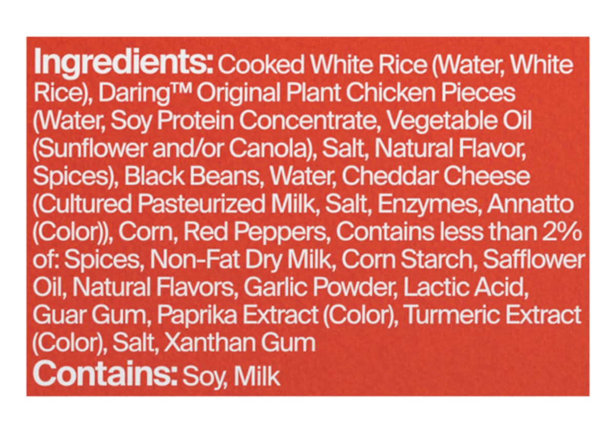 Ingredients: Cooked White Rice (Water, White Rice), Daring Original Plant Chicken Pieces (Water, Soy Protein Concentrate, Vegetable Oil (Sunflower and/or Canola), Salt, Natural Flavor, Spices), Black Beans, Water, Cheddar Cheese (Cultured Pasteurized Milk, Salt, Enzymes, Annatto (Color)), Corn, Red Peppers, Contains Less than 2% of: Spices, Non-Fat Dry Milk, Corn Starch, Safflower Oil, Natural Flavors, Garlic Powder, Lactic Acid, Guar Gum, Paprika Extract (Color), Turmeric Extract (Color), Salt, Xanthan Gum Contains: Soybeans, Milk, Corn