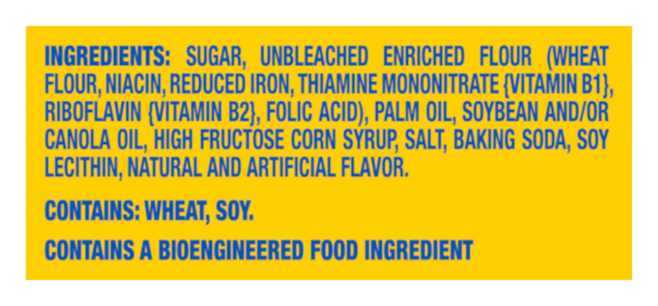 Ingredients: Sugar, Unbleached Enriched Flour (Wheat Flour Niacin Reduced Iron Thiamine Mononitrate {Vitamin B1} Riboflavin {Vitamin B2} Folic Acid), Palm Oil, Soybean and/or Canola Oil, High Fructose Corn Syrup, Salt, Baking Soda, Soy Lecithin, Natural and Artificial Flavor Contains: Corn, Wheat, Soybeans