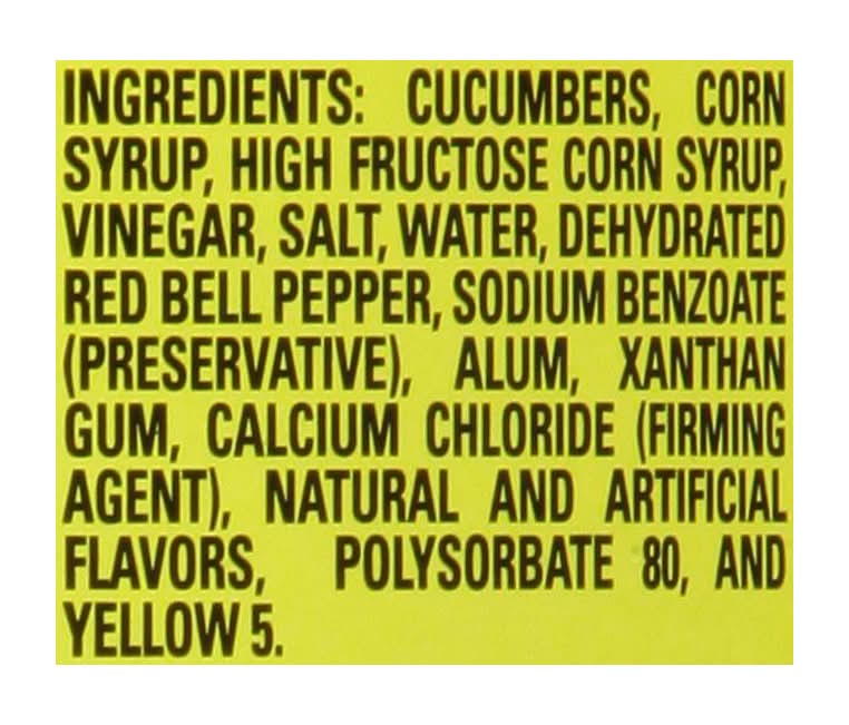 Ingredients: Cucumbers Corn Syrup, High Fructose Corn Syrup Vinegar, Salt, Water, Dehydrated Red Bell Pepper, Sodium Benzoate (Preservative), Alum, Xanthan Gum, Calcium Chloride (Firming Agent), Natural and Artificial Flavors, Polysorbate 80, and Yellow 5