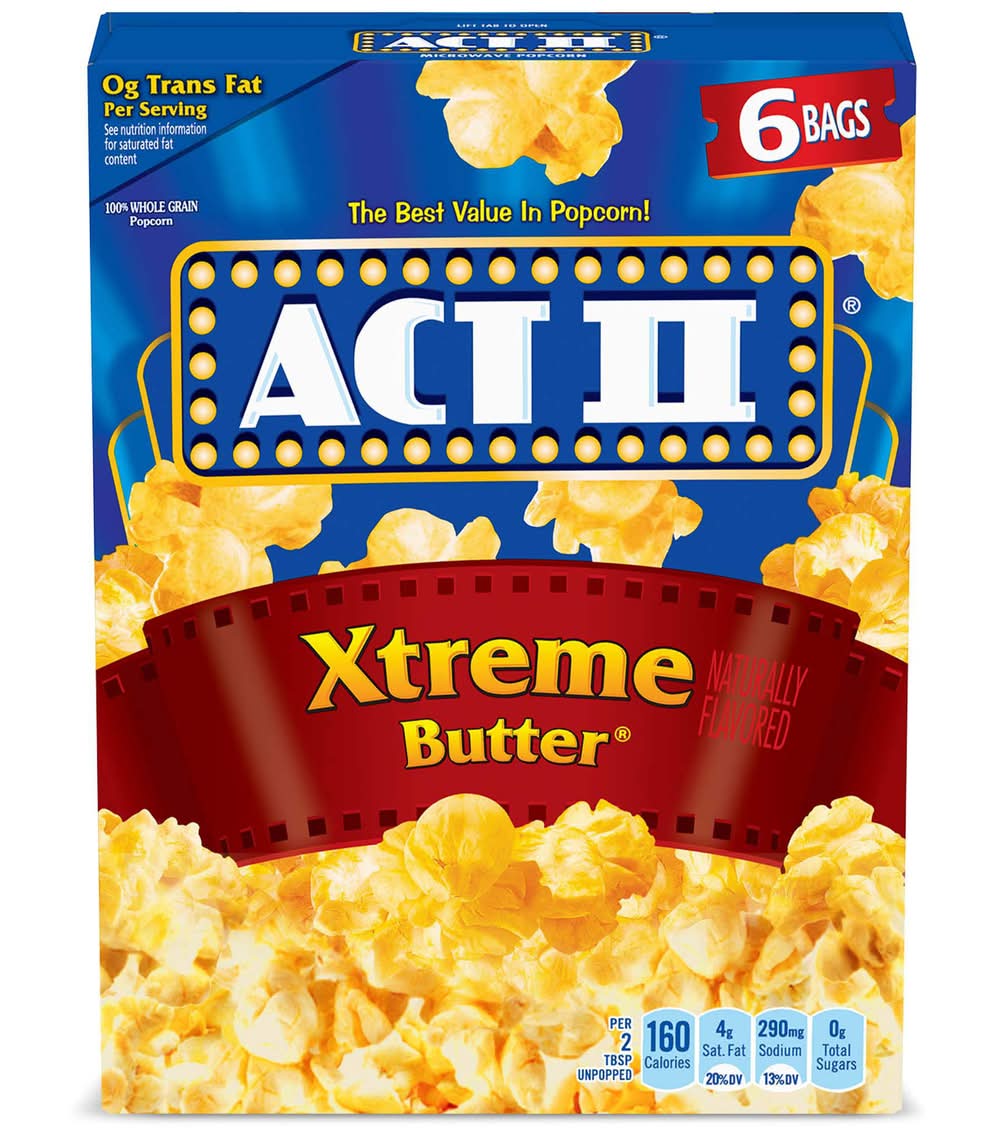 Extreme butter lovers know there's no such thing as too much butter, savory treat. Every bag is made with 100% whole grain popcorn kernels, 0 grams of trans fat and high-impact butter flavor. Serve this extra buttery microwave popcorn at your next party or gathering, or keep that buttery goodness all to yourself. • Flavor: Xtreme butter • Conagra Brands, PO Box 3534, Dept. A2, Chicago, IL, 60654