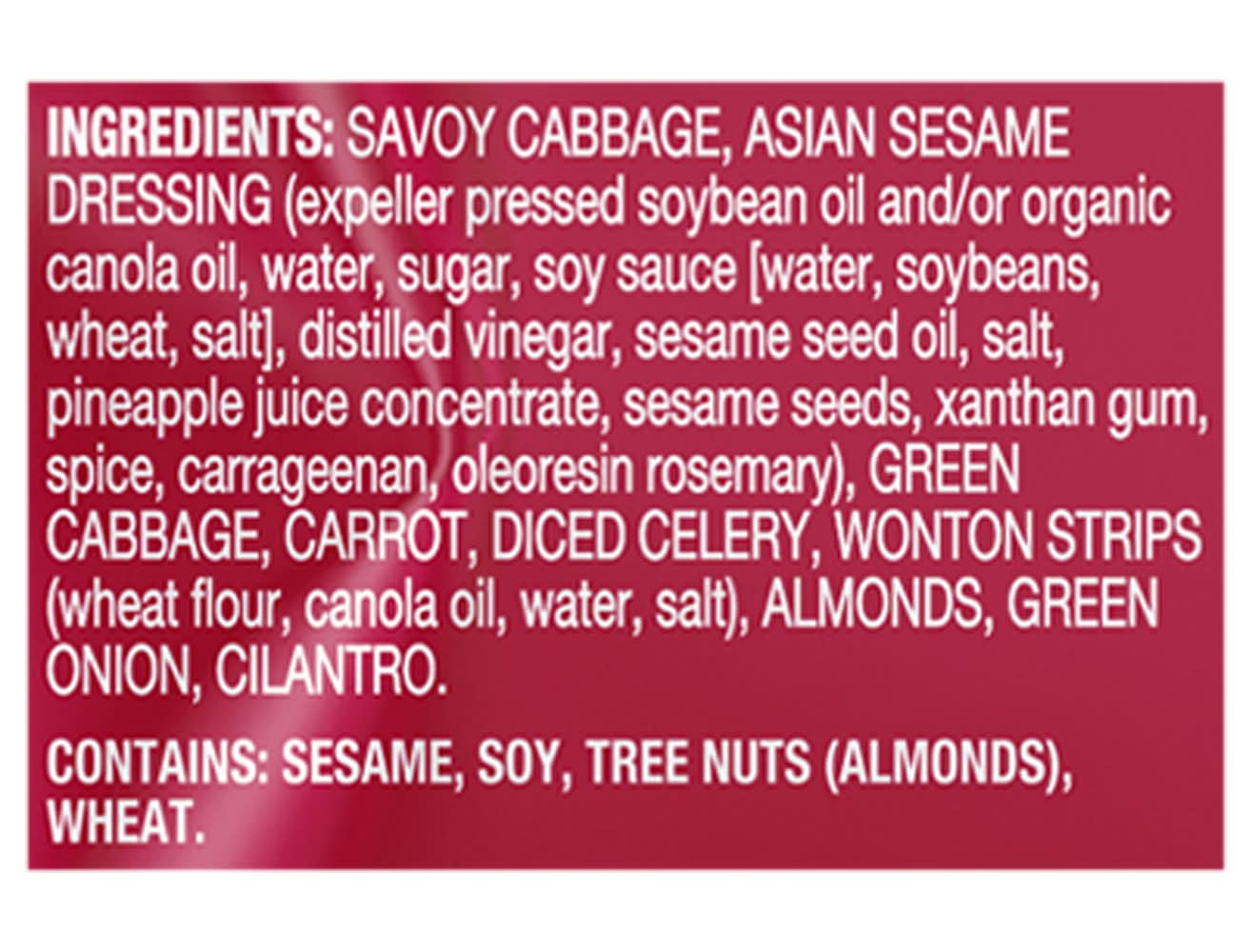 Ingredients: Savoy Cabbage, Asian Sesame Dressing (Expeller Pressed Soybean Oil and/or Organic Canola Oil, Water, Sugar, Soy Sauce [Water, Soybeans, Wheat, Salt], Distilled Vinegar, Sesame Seed Oil, Salt, Pineapple Juice Concentrate, Sesame Seeds, Xanthan Gum, Spice, Carrageenan, Oleoresin Rosemary), Green Cabbage, Carrot, Diced Celery, Wonton Strips (Wheat Flour, Canola Oil, Water, Salt), Almonds, Green Onion, Cilantro Contains: Sesame, Soybeans, Tree Nuts, Almonds, Wheat, Celery, Tree Nuts