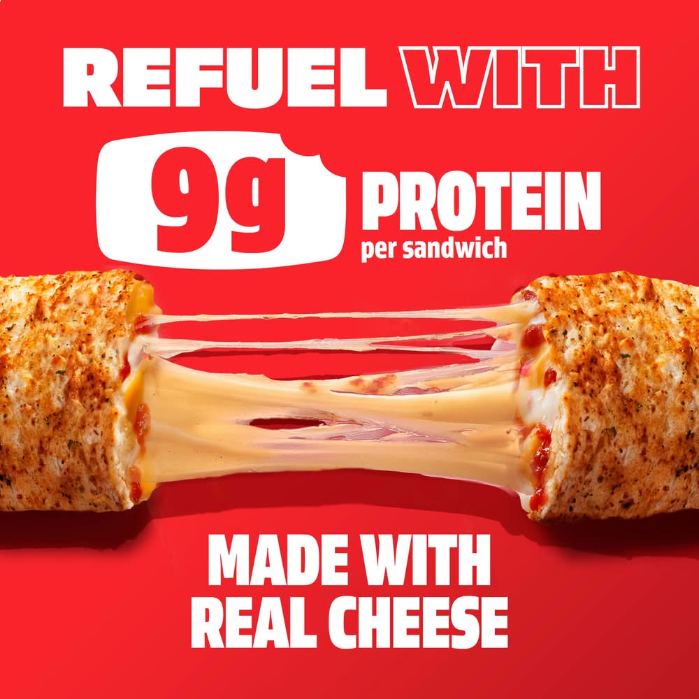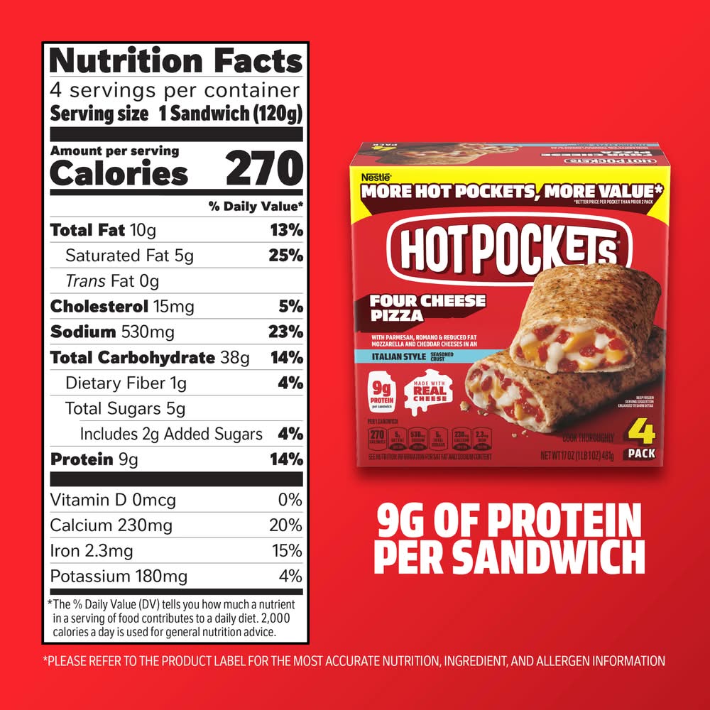 Dive into the cheesy, saucy and savory world of snacking with frozen snacks. This box comes with pizza, so you can share with friends and family or save some for later. Our frozen sandwiches are loaded with a mouth-watering mix of parmesan and Romano, with reduced-fat mozzarella and cheddar cheese, stuffed inside a delicious Italian style seasoned crust. These indulgent four cheese pizza aren’t your average pizza rolls or frozen cheese snacks. This frozen sandwiches are hunger’s worst nightmare, delivering the bold flavors of a satisfying cheese pizza or melty cheese sandwich in a hearty microwaveable snack. Great for gaming all night, a quick snack after school or a quick bite before heading out the door – This frozen sandwiches are perfect for any occasion. These frozen sandwiches are a good source of protein with 9 grams per serving. Cook this microwave food for 1 minute 50 seconds on high for a quick on-the-go snack, or air fry at 360 degrees Fahrenheit for 11 minutes if you want a crispier crust. Four cheese are hot and delicious every time. Keep Hot Pockets Four Cheese Pizza frozen sandwiches frozen until ready to cook and eat. • Flavor: Four cheese pizza • Packaging: Reusable