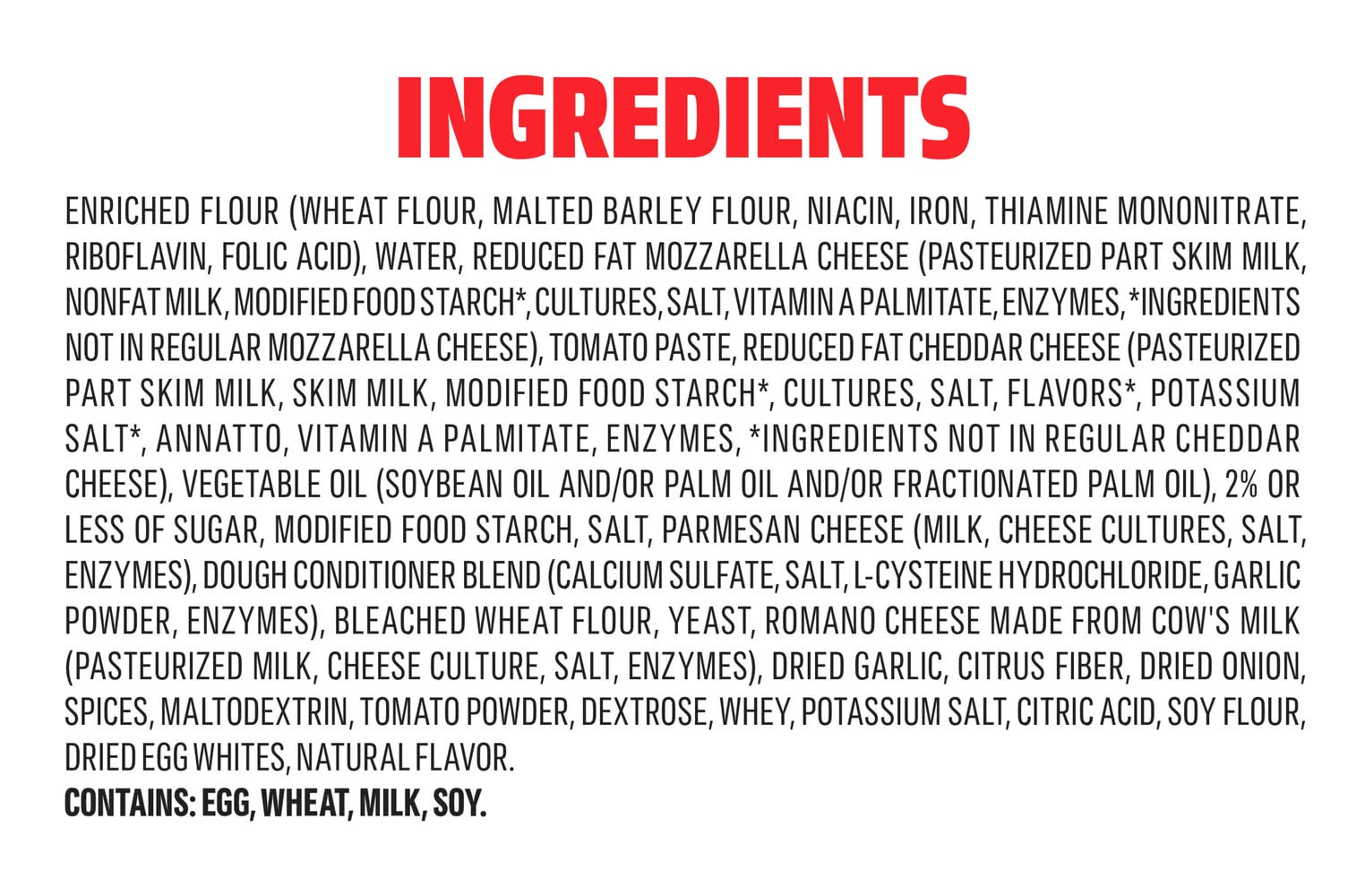 Ingredients: ENRICHED FLOUR (WHEAT FLOUR, MALTED BARLEY FLOUR, NIACIN, IRON, THIAMINE MONONITRATE, RIBOFLAVIN, FOLIC ACID), WATER, REDUCED FAT MOZZARELLA CHEESE (PASTEURIZED PART SKIM MILK, NONFAT MILK, MODIFIED FOOD STARCH*, CULTURES, SALT, VITAMIN A PALMITATE, ENZYMES, *INGREDIENTS NOT IN REGULAR MOZZARELLA CHEESE), TOMATO PASTE, REDUCED FAT CHEDDAR CHEESE (PASTEURIZED PART SKIM MILK, SKIM MILK, MODIFIED FOOD STARCH*, CULTURES, SALT, FLAVORS*, POTASSIUM SALT*, ANNATTO, VITAMIN A PALMITATE, ENZYMES, *INGREDIENTS NOT IN REGULAR CHEDDAR CHEESE), VEGETABLE OIL (SOYBEAN OIL AND/OR PALM OIL AND/OR FRACTIONATED PALM OIL AND/OR CANOLA OIL), SUGAR, 2% OR LESS OF SALT, MODIFIED FOOD STARCH, PARMESAN CHEESE (PASTEURIZED MILK, CHEESE CULTURES, SALT, ENZYMES), BLEACHED WHEAT FLOUR, DOUGH CONDITIONER BLEND (CALCIUM SULFATE, SALT, L-CYSTEINE HYDROCHLORIDE, GARLIC POWDER, ENZYMES), ROMANO CHEESE MADE FROM COW'S MILK (PASTEURIZED MILK, CHEESE CULTURES, SALT, ENZYMES), CITRUS FIBER, DRIED GARLIC, DRIED ONION, SPICES, MALTODEXTRIN, DEXTROSE, WHEY, POTASSIUM SALT, YEAST, SOY LECITHIN, CITRIC ACID, SOY FLOUR, EGG WHITES. Contains: Wheat, Barley, Milk, Soybeans, Eggs Additives: Genetically Modified Ingredients