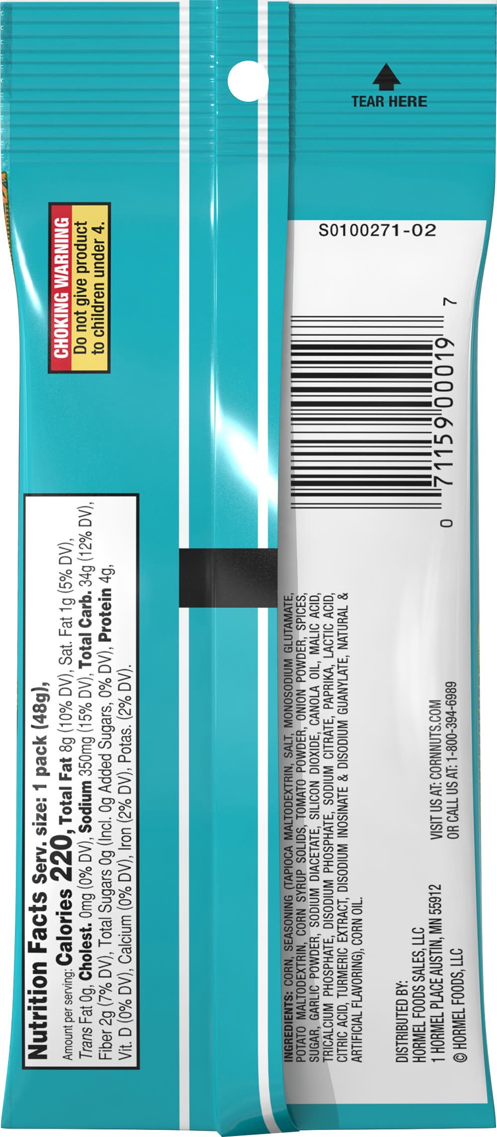 Ingredients: Corn, Seasoning (Tapioca Maltodextrin, Salt, Monosodium Glutamate, Potato Maltodextrin, Corn Syrup Solids, Tomato Powder, Onion Powder, Spices, Sugar, Garlic Powder, Sodium Diacetate, Silicon Dioxide, Canola Oil, Malic Acid, Tricalcium Phosphate, Disodium Phosphate, Sodium Citrate, Paprika, Lactic Acid, Citric Acid, Turmeric Extract, Disodium Inosinate & Disodium Guanylate, Natural & Artificial Flavoring), Corn Oil Contains: Corn