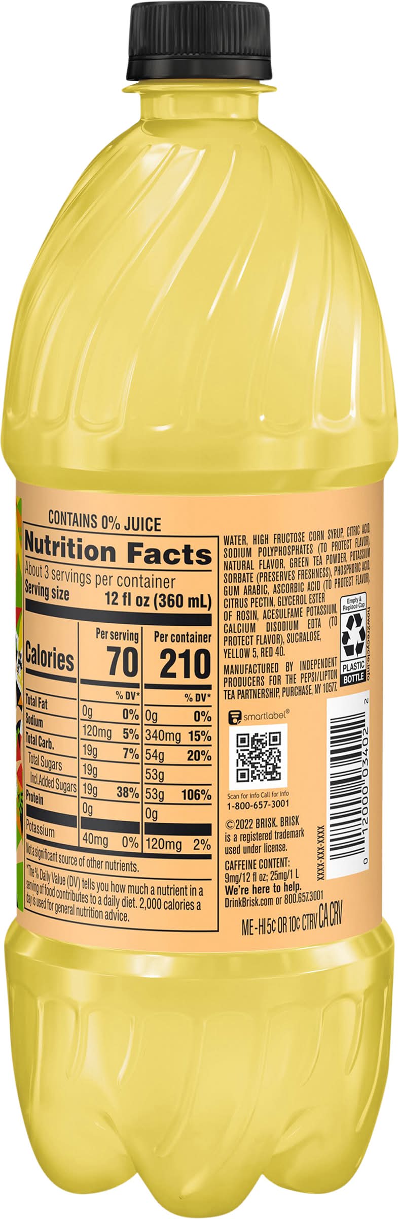 Flavor with other natural flavors. 70 calories per 12 fl oz serving. Caffeine Content: 9 mg/12 fl oz; 25 mg/1. • Brand: Brisk • Flavor: Peach • The Pepsi/Lipton Tea Partnership, Purchase, NY, 10577 • Packaging: Reusable