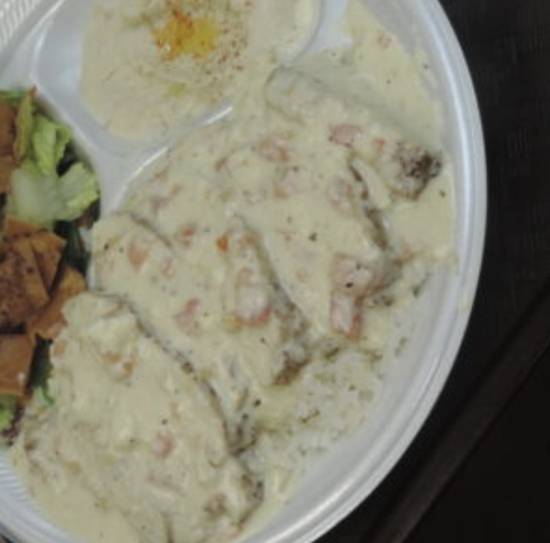 Athenian Chicken – Slices of grilled organic chicken breast, prepared to perfection and coated in a delicious garlicky and creamy sauce. It is served with side of distinctively flavourful rice, house salad, hummus, and pita bread. Plus, If you prefer you can customize your plate to your preferences!