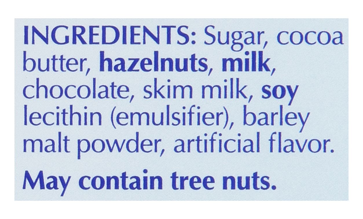 Ingredients: Sugar, cocoa butter, hazelnuts, milk, chocolate, skim milk, soya lecithin (emulsifier), barley malt powder, artificial flavor Contains: hazelnuts, milk, soy