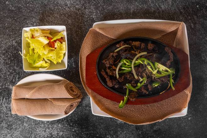 Strips of tender beef sautéed in oil with onions, flavorful herbs, and berbere (Ethiopian spice sauce).