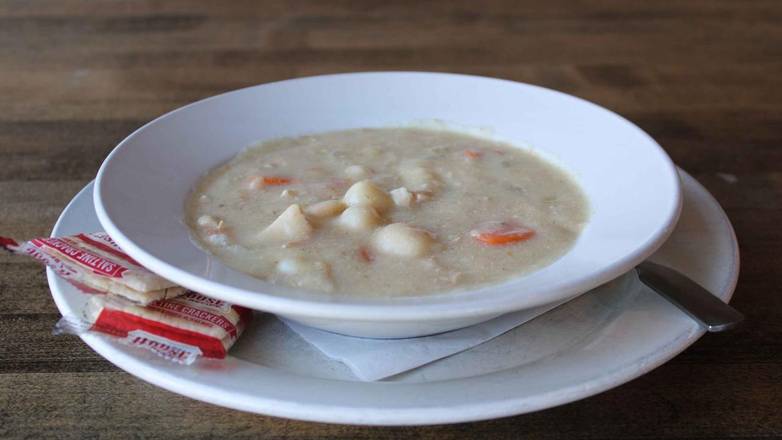 Fresh all white chicken in a thick broth with carrots, celery and homemade dumplings.