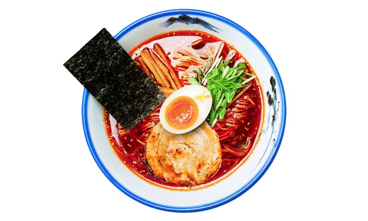 spicy shoyu tare, chicken broth, chi-yu, menma, greens, chashu, egg, nori, leeks, chili sesame, yuzu, thin noodle