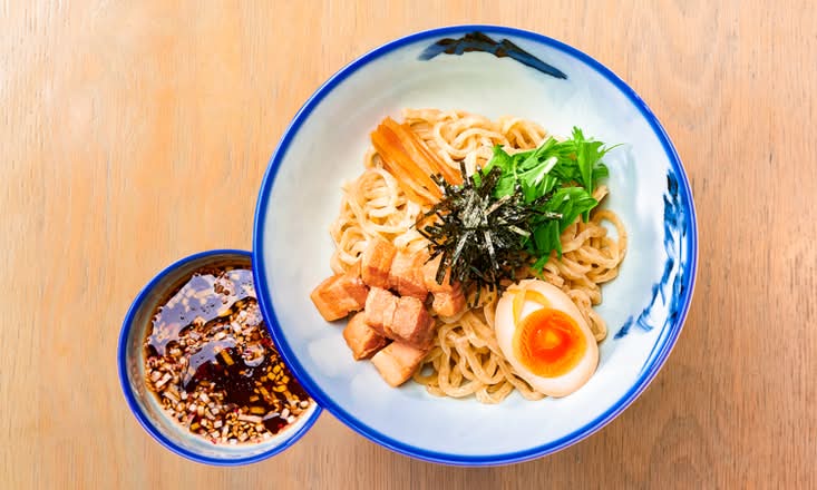 yuzu-shoyu tsuyu, chi-yu, braised kakuni pork, menma, frisee, egg, chili sesame, scallion, kizami nori, yuzu peel, thick noodle