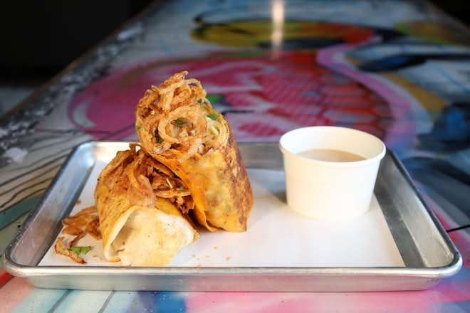 Chopped Crispy Chicken, Mac N Cheese, Sweet & Spicy Bacon, Queso, White Cheddar, Agave BBQ Jam, BBQ Ranch Dipping Sauce