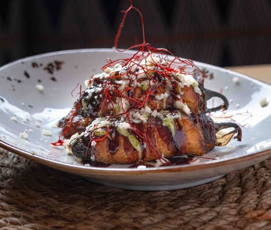 3 Blistered Jalapenos, goat cheese, tequila bacon, cilantro garlic salsa, balsamic, queso fresco