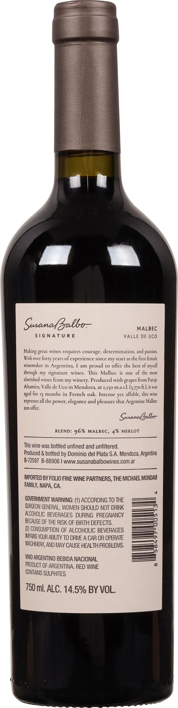 2019 Blend: 96% malbec; 4% merlot. Signature. Mendoza- Argentina. This wine was bottled unfined and unfiltered. Making great wines requires courage, determination, and passion. With over forty years of experience since my start as the first female winemaker in Argentina, I am proud to offer the best of myself through my signature wines. This Malbec is one of the most cherished wines from my winery. Produced with grapes from Paraje Altamira, Valle de Uco in Mendoza, at 1,150 m.a.s.l. 3,77o ft.), it was aged for 13 months in French oak. Intense yet affable, this wine expresses all the power, elegance and pleasure that Argentine Malbec can offer. Susana Balbo. 2019 blend: 96% m Malbec, 4% Merlot. Malbec Alc. 14.5% by vol. 29 Product of Argentina. Produced & bottled by Dominio del Plata S.A. Mendoza Argentina. B- 72597. B- 88906. • Brand: Susana balbo • Features : biodynamic, eco-friendly, oak aged • Alcohol by volume: 14.5% • Full bodied • Sweet-dry scale: dry • Tasting notes: currant, dark fruit, minerality, oak, smoky, velvety • Food pairing: beef, mushrooms, pork • Suggested serving temperature: 65° F • Suggested glassware: standard red glass • 2019