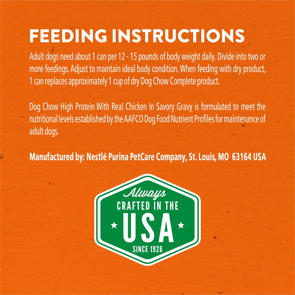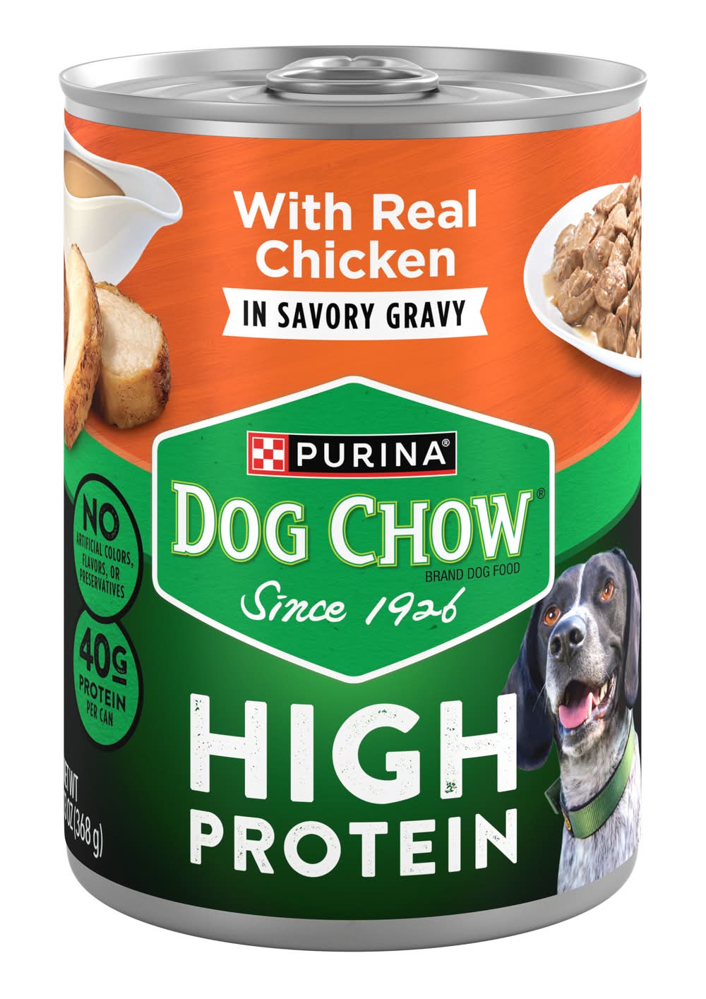 Tempt your dog's taste buds at every meal when you serve Purina Dog Chow High Protein Wet Dog Food With Real Chicken in Savory Gravy. Featuring meaty chunks with real chicken, this delicious wet canned dog food recipe gives him the same quality nutrition he's accustomed to in Dog Chow dry food, but in a savory wet dog food formula. Each can of this dog food in gravy delivers 40 grams of protein to your pet's diet to promote his strong muscles, helping him lead a happy, active life. Savory dog food gravy surrounds each chunky morsel, giving your canine something to lick as he works his way to the bottom of his dish. This real meat dog food contains no artificial colors, flavors or preservatives. Make this wet dog food with high protein his regular mealtime fare to ensure your adult dog gets the 100 percent complete and balanced nutrition that his body needs and that you demand, all from a name you know and trust.