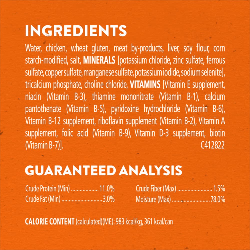 Ingredients: Water, Chicken, Wheat Gluten, Meat By-products, Liver, Soy Flour, Corn Starch-modified, Salt, Minerals [Potassium Chloride, Zinc Sulfate, Ferrous Sulfate, Copper Sulfate, Manganese Sulfate, Potassium Iodide, Sodium Selenite], Tricalcium Phosphate, Choline Chloride, Vitamins [Vitamin E Supplement, Niacin (Vitamin B-3), Thiamine Mononitrate (Vitamin B-1), Calcium Pantothenate (Vitamin B-5), Pyridoxine Hydrochloride (Vitamin B-6), Vitamin B-12 Supplement, Riboflavin Supplement (Vitamin B-2), Vitamin A Supplement, Folic Acid (Vitamin B-9), Vitamin D-3 Supplement, Biotin (Vitamin B-7)], . C412822