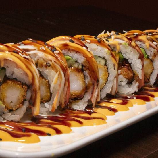 Shrimp tempura, avocado topped with crab stick and spicy mayo, eel sauce.