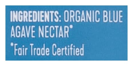 USDA Organic. Certified Organic by Quality Assurance International US-ORG-050. Gluten free. Vegan. Non GMO Project verified 100% pure. Fair Food Creates Stronger Communities: Carefully harvested using traditional methods. Nothing else but pure agave for the ultimate low-glycemic and sustainably-sourced plant-based sweetener. For delicious recipes, . Bottle made from up to 30% plant-based resin. Fair Trade Certified. Please recycle. Product of Mexico. • Wholesome Sweeteners, Inc., Sugar Land,TX,77478 • Packaging: Reusable