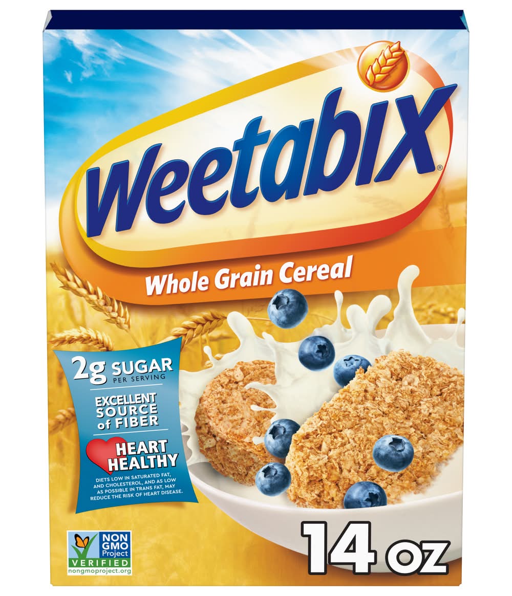 Post Weetabix Whole Grain Breakfast Cereal can help you feel full longer. Made with simple ingredients, this high fiber cereal is made with whole grain wheat and comes in delicious biscuits with a crunchy texture. Weetabix Cereal has 2 grams of sugar per serving, and the cereal is Non-GMO Project Verified. Enjoy this high fiber cereal with milk or add fruit and other toppings for a great start to your morning, or snack on a few biscuits of the whole grain cereal at any time of day.