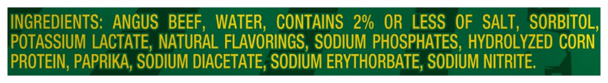 Ingredients: Angus Beef, Water, Contains 2% or Less of Salt, Sorbitol, Potassium Lactate, Natural Flavorings, Sodium Phosphates, Hydrolyzed Corn Protein, Paprika, Sodium Diacetate, Sodium Erythorbate, Sodium Nitrite