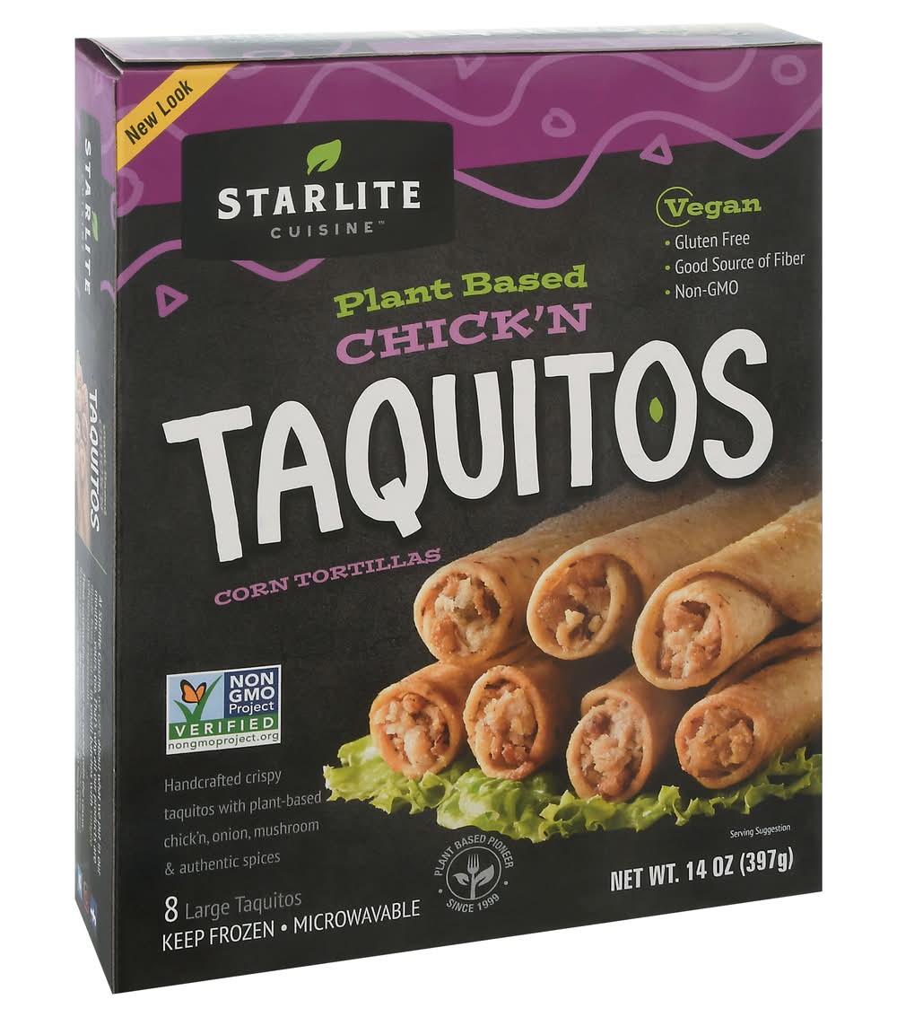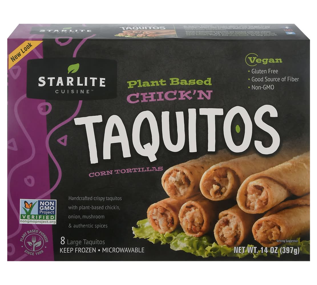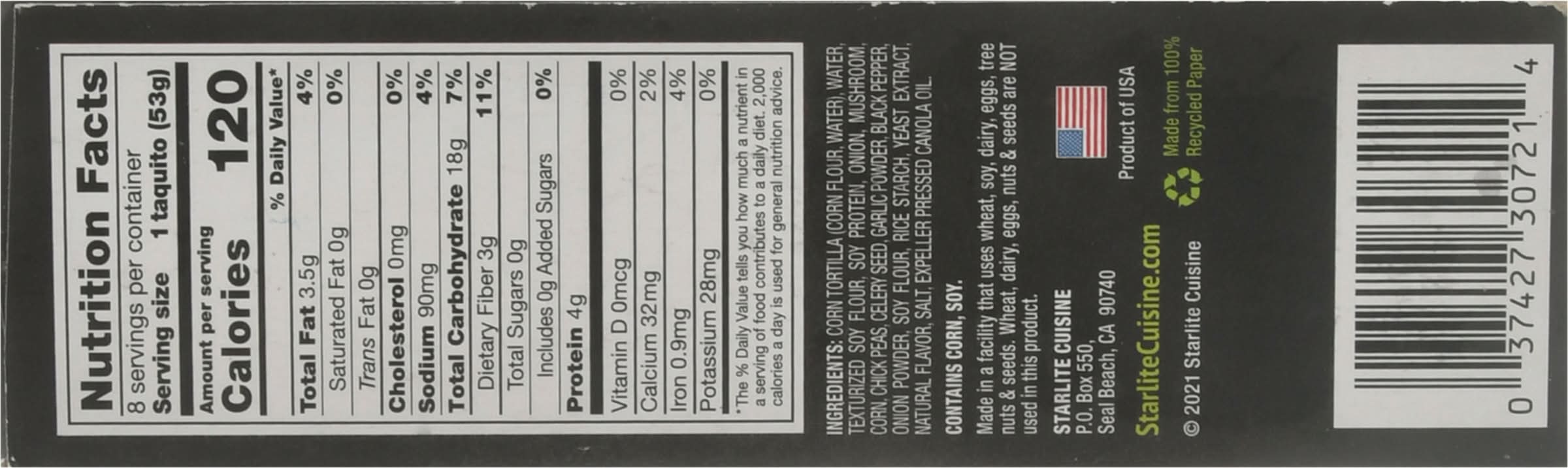 Ingredients: Corn Tortilla (Corn Flour, Water), Water, Texturized Soy Flour, Soy Protein, Onion, Mushroom, Chili Powder, Paprika, Cumin, Thyme, Oregano, Garlic Powder, Soy Flour, Rice Starch, Yeast Extract, Salt, Expeller Pressed Canola Oil, Corn Tortilla (Corn Flour, Water), Water, Texturized Soy Flour, Soy Protein, Onion, Mushroom, Corn, Chick Peas, Celery Seed, Garlic Powder, Black Pepper, Onion Powder, Soy Flour, Rice Starch, Yeast Extract, Natural Flavor, Salt, Expeller Pressed Canola Oil Contains: Soybeans