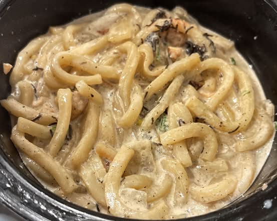 Savory udon noodles with salmon and creamy mentai sauce, stir-fried for a delightful fusion experience.