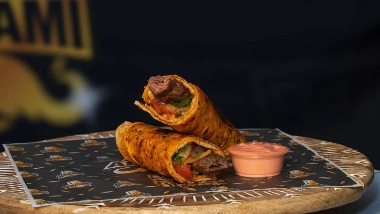 Spiced beef kebab grilled to perfection, wrapped in soft bread, and topped with flavorful Turkish sauce, fresh onions, juicy tomatoes, and parsley.