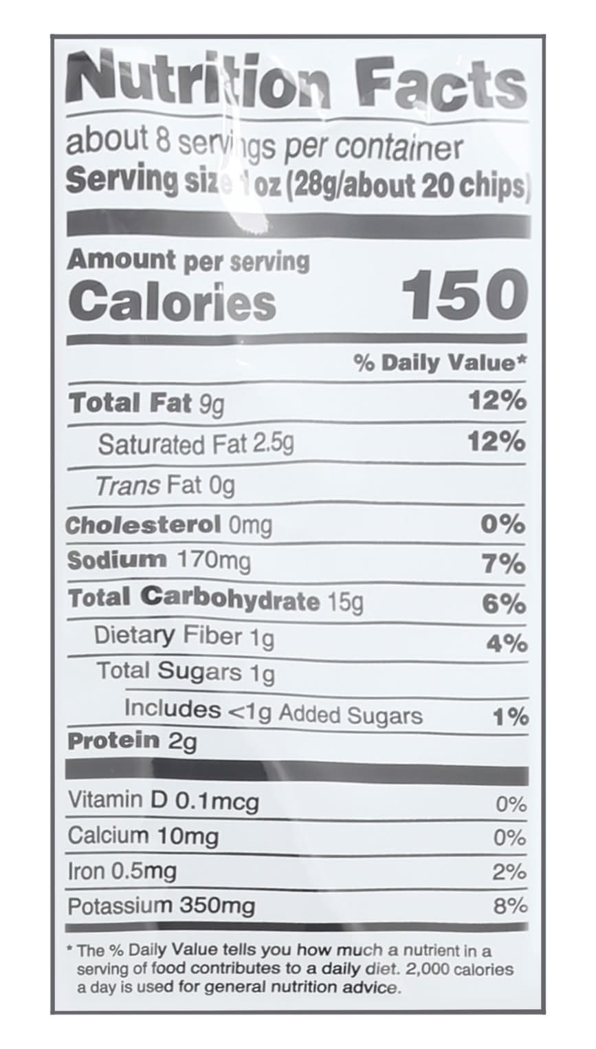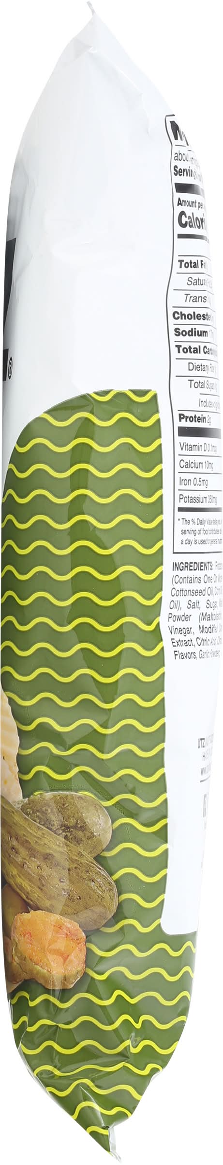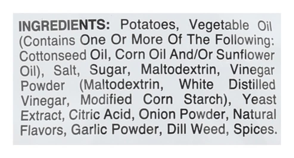 Ingredients: Potatoes, Vegetable Oil (Contains One or More of the Following: Cottonseed Oil, Corn Oil and/or Sunflower Oil), Salt, Sugar, Maltodextrin, Vinegar Powder (Maltodextrin, White Distilled Vinegar, Modified Corn Starch) Yeast Extract, Citric Acid, Onion Powder, Natural Flavors, Garlic Powder, Dill Weed, Spices Contains: Corn
