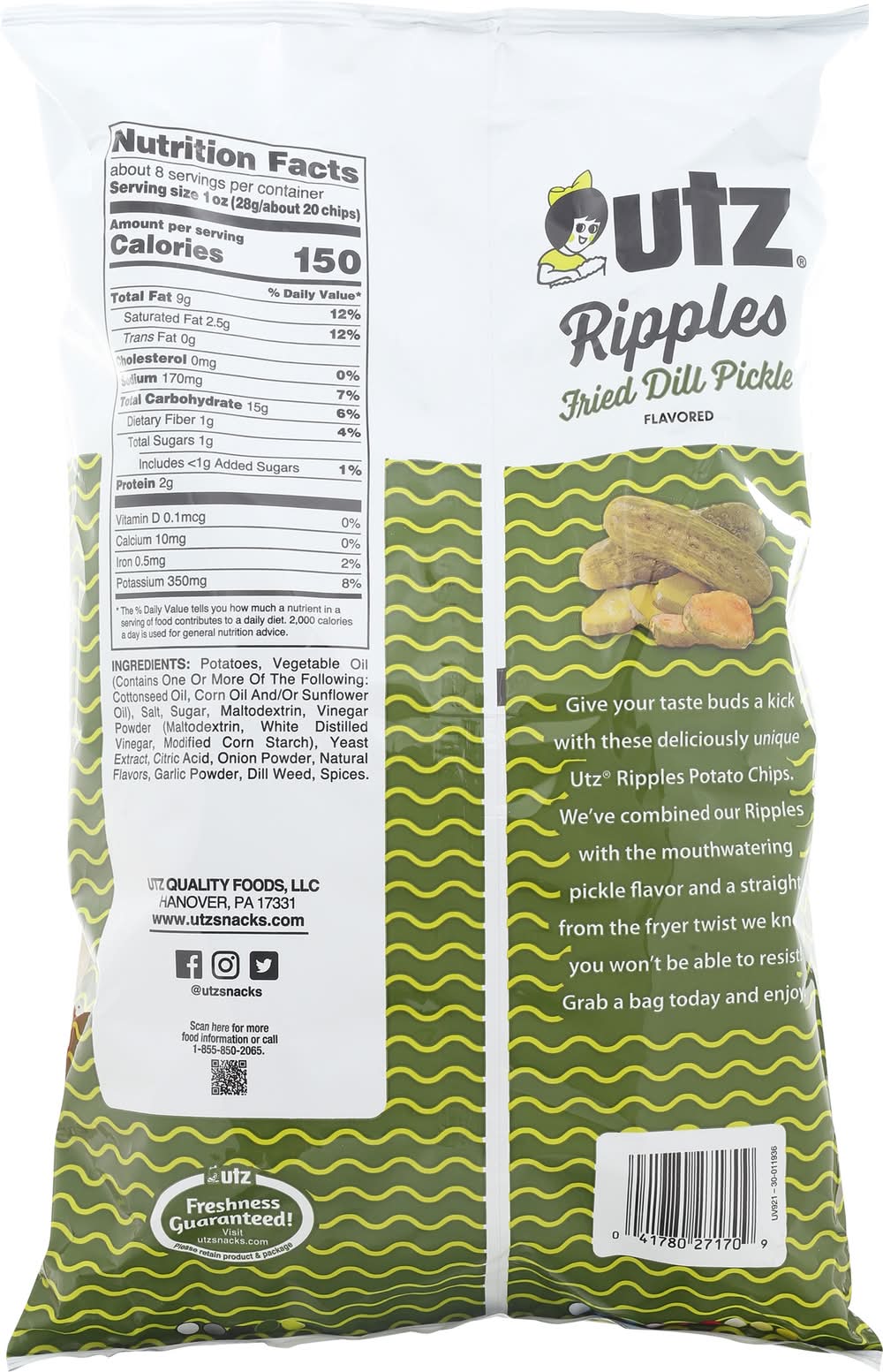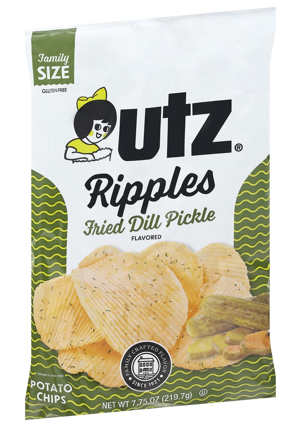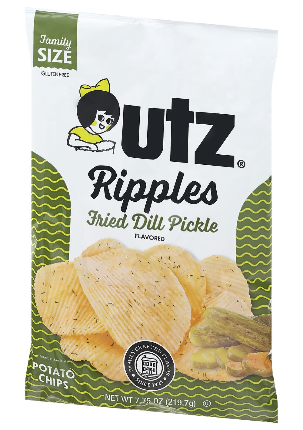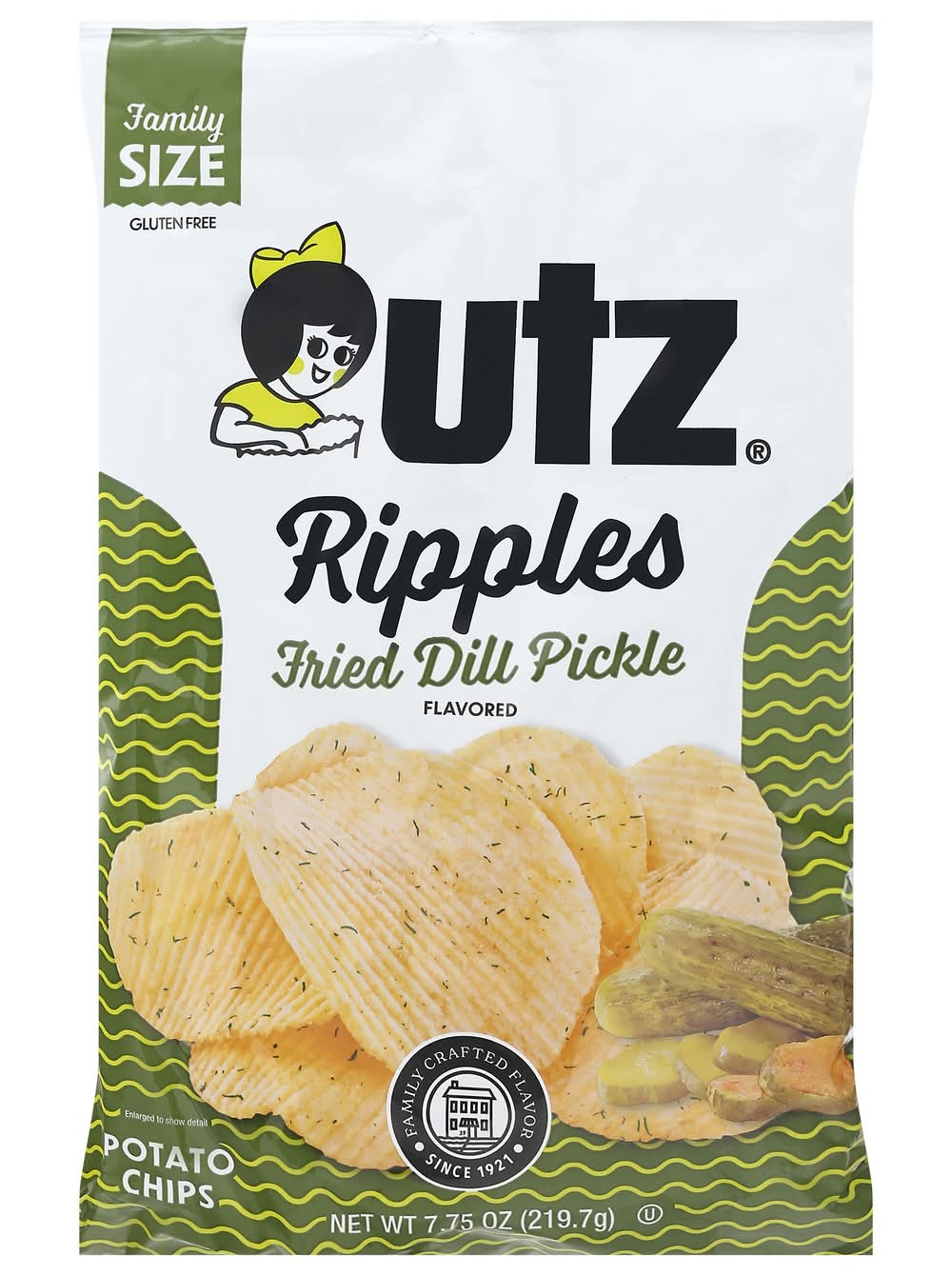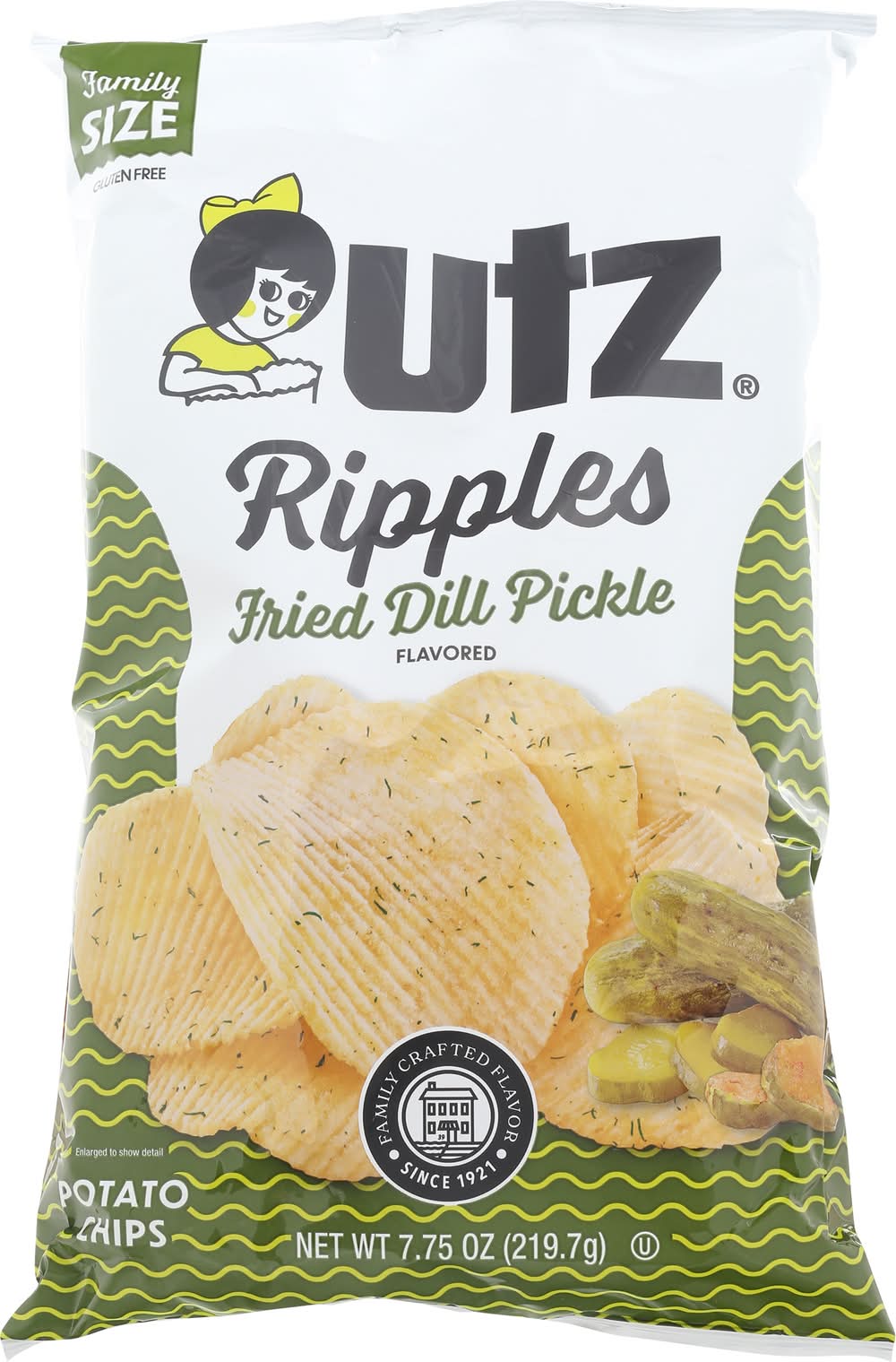 Potato Chips, Fried Dill Pickle Flavored, Ripples, Family Size Flavor: Fried dill pickle