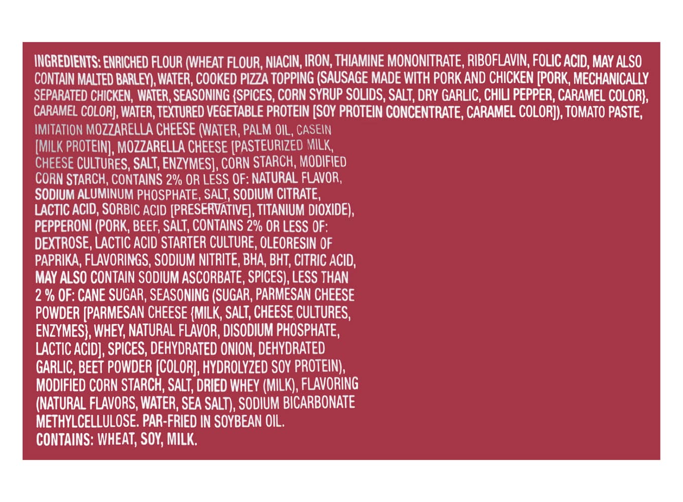 Ingredients: Enriched Flour (Wheat Flour, Niacin, Iron, Thiamine Mononitrate, Riboflavin, Folic Acid, May Also Contain Malted Barley), Water, Cooked Pizza Topping (Sausage Made with Pork and Chicken [Pork, Mechanically Separated Chicken, Water, Seasoning (Spices, Corn Syrup Solids, Salt, Dry Garlic, Chili Pepper, Caramel Colori, Caramel Color], Water, Textured Vegetable Protein [Soy Protein Concentrate, Caramel Color]), Tomato Paste, Imitation Mozzarella Cheese (Water, Palm Oil, Casein [Milk Protein), Mozzarella Cheese [Pasteurized Milk, Cheese Cultures, Salt, Enzymes), Corn Starch, Modified Corn Starch, Contains 2% or Less of: Natural Flavor, Sodium Aluminum Phosphate, Salt, Sodium Citrate, Lactic Acid, Sorbic Acid [Preservative], Titanium Dioxide), Pepperoni (Pork, Beef, Salt, Contains 2% or Less of: Dextrose, Lactic Acid Starter Culture, Oleoresin of Paprika, Flavorings, Sodium Nitrite, BHA, BHT, Citric Acid, May Also Contain Sodium Ascorbate, Spices), Less than 2% of: Cane Sugar, Seasoning (Sugar, Parmesan Cheese Powder [Parmesan Cheese (Milk, Salt, Cheese Cultures, Enzymes), Whey, Natural Flavor, Disodium Phosphate, Lactic Acid], Spices, Dehydrated Onion, Dehydrated Garlic, Beet Powder [Color], Hydrolyzed Soy Protein), Modified Corn Starch, Salt, Dried Whey (Milk), Flavoring (Natural Flavors, Water, Sea Salt), Sodium Bicarbonate Methylcellulose, Par-Fried in Soybean Oil. Contains: Wheat, Soybeans, Milk, Corn, Barley