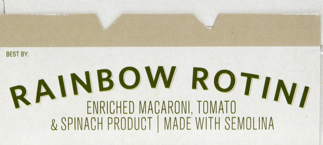 Ingredients: Durum Wheat Semolina, Tomato Solids, Dried Spinach, Niacin, Iron (Ferrous Sulfate), Thiamin Mononitrate, Riboflavin, Folic Acid. Contains: Wheat