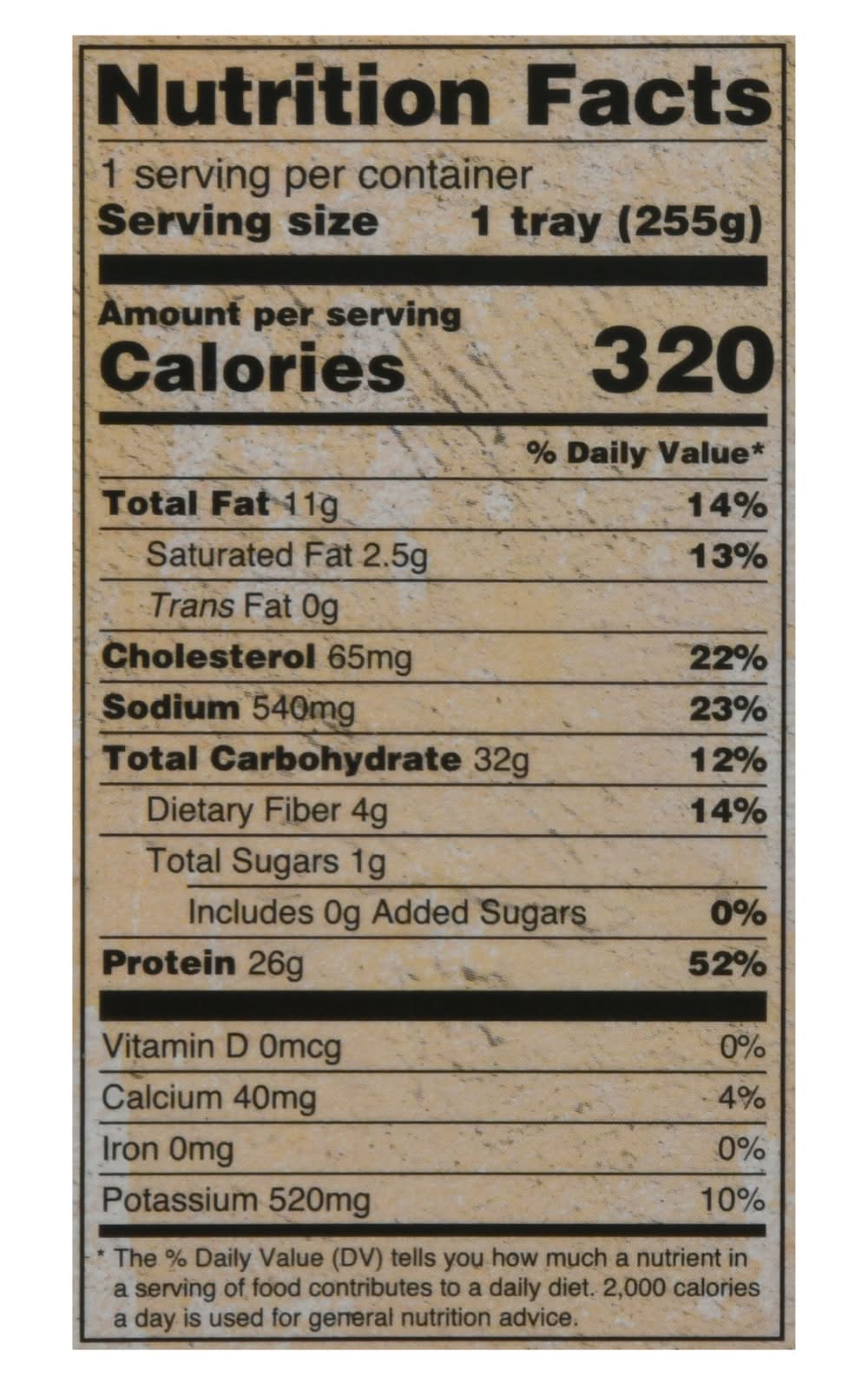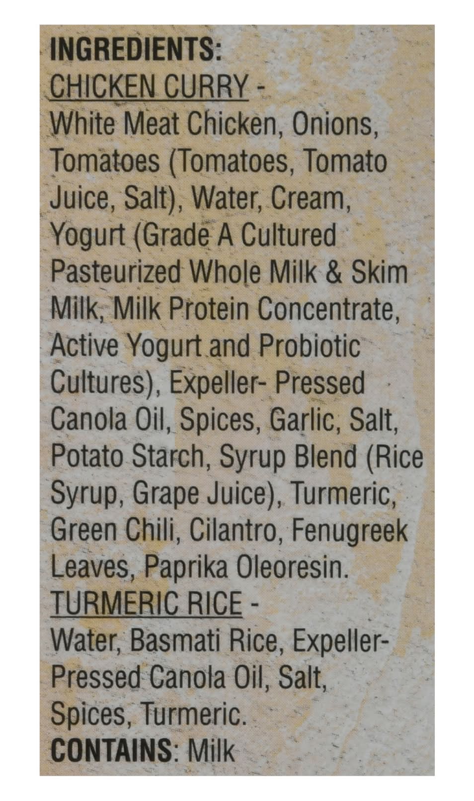 Ingredients: Chicken Curry: White Meat Chicken, Onions, Tomatoes (Tomatoes Tomato Juice Salt), Water, Cream, Yogurt (Grade A Cultured Pasteurized Whole Milk & Skim Milk Milk Protein Concentrate Active Yogurt and Probiotic Cultures), Expeller- Pressed Canola Oil, Spices, Garlic, Salt, Potato Starch, Syrup Blend (Rice Syrup Grape Juice), Turmeric, Green Chili, Cilantro, Fenugreek Leaves, Paprika Oleoresin. Turmeric Rice: Water, Basmati Rice, Expeller-Pressed Canola Oil, Salt, Spices, Turmeric Contains: Milk