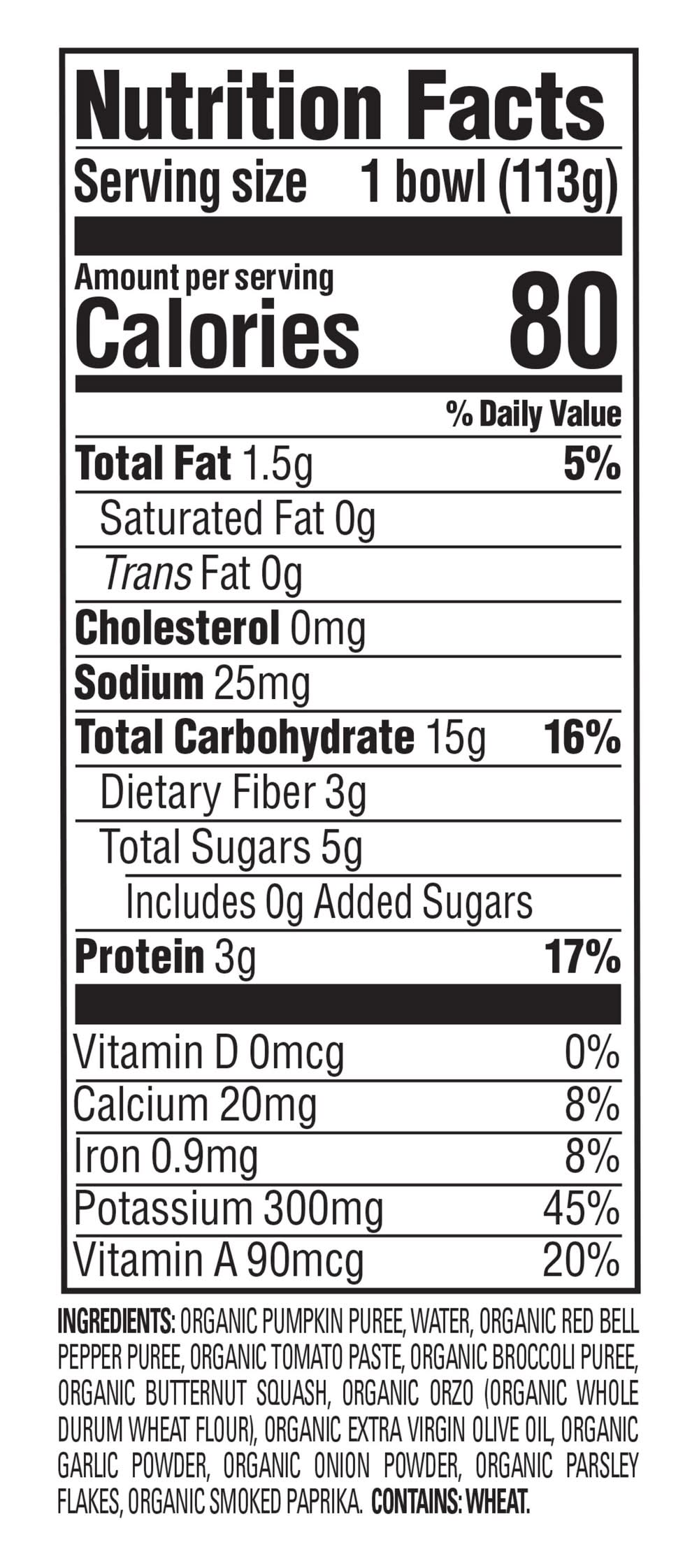 Ingredients: ORGANIC PUMPKIN PUREE, WATER, ORGANIC RED BELL PEPPER PUREE, ORGANIC TOMATO PASTE, ORGANIC BROCCOLI PUREE, ORGANIC BUTTERNUT SQUASH, ORGANIC ORZO (ORGANIC WHOLE DURUM WHEAT FLOUR), ORGANIC EXTRA VIRGIN OLIVE OIL, ORGANIC GARLIC POWDER, ORGANIC ONION POWDER, ORGANIC PARSLEY FLAKES, ORGANIC SMOKED PAPRIKA. Contains: WHEAT