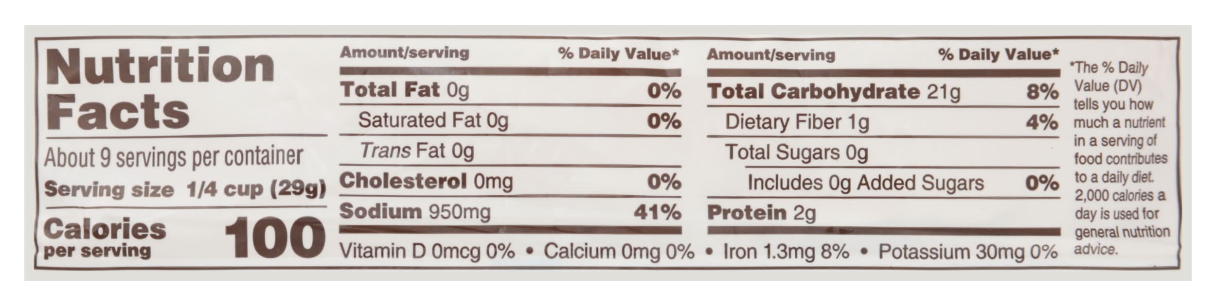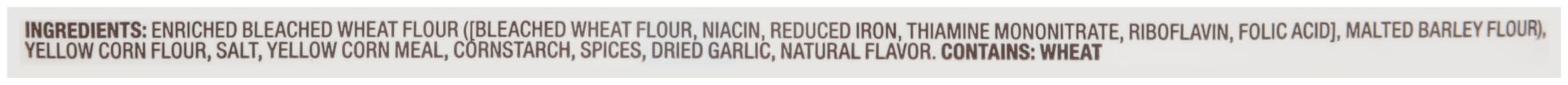 Ingredients: Enriched Bleached Wheat Flour ([Bleached Wheat Flour, Niacin, Reduced Iron, Thiamine Mononitrate, Riboflavin, Folic Acid), Malted Barley Flour), Yellow Corn Flour, Salt, Yellow Corn Meal, Cornstarch, Spices, Dried Garlic, Natural Flavor Contains: Wheat, Barley, Corn