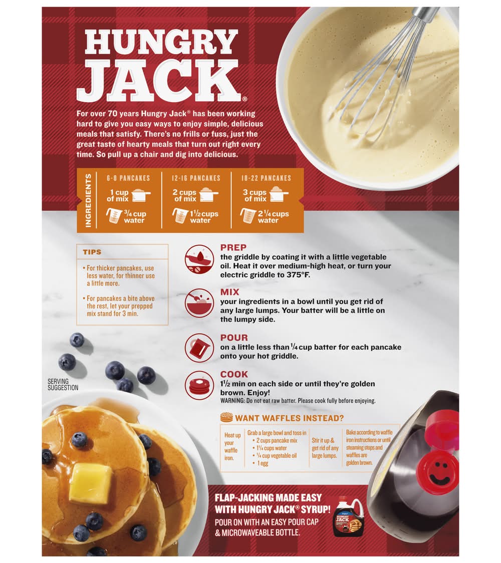 Ingredients: 6-8 pancakes: 1 cup of mix; 3/4 cup water; 12-16 pancakes: 2 cups of mix; 1-1/2 cups water; 18-22 pancakes: 3 cups of mix. 2-1/4 cups water. prep: the griddle by coating it with a little vegetable oil. heat it over medium-high heat, or turn your electric griddle to 375 degrees f. mix: your ingredients in a bowl until you get rid of any large lumps. your batter will be a little on the lumpy side. pour: on a little less than 1/4 cup batter for each pancake onto your hot griddle. cook: 1-1/2 min on each side or until they're golden brown. enjoy! want waffles instead? makes 12 4x4 waffles. heat up your waffle iron. grab a large bowl and toss in: 2 cups pancake mix; 1-1/4 cups water; 1/4 cup vegetable oil. 1 egg. stir it up & get rid of any large lumps. bake them in the hot waffle iron until steaming stops & waffles are golden brown. tips: for thicker pancakes, use less water, for thinner use a little more. for pancakes a bite above the rest, let your prepped mix stand for 3 min. to open, lift tab.