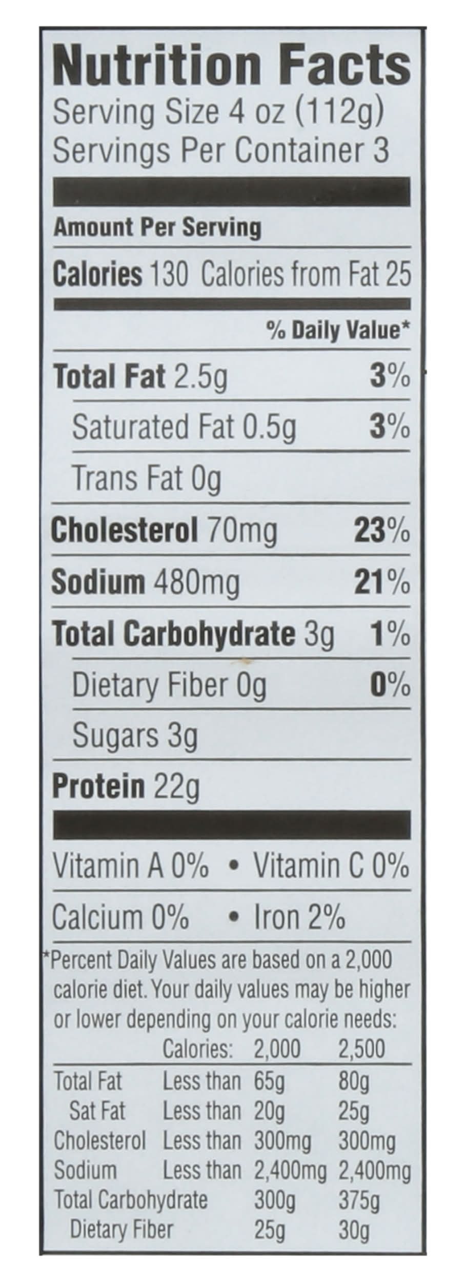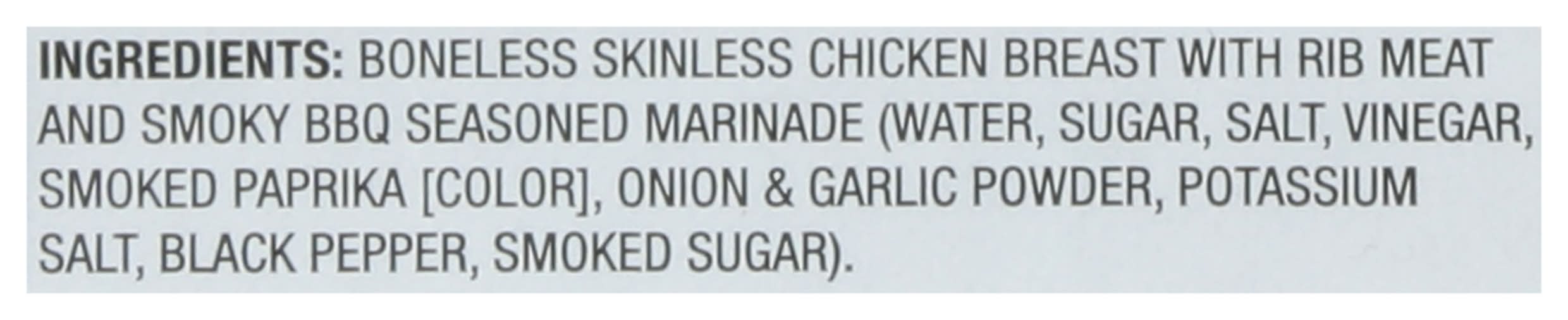 Ingredients: Boneless Skinless Chicken Breast with Rib Meat and Smoky BBQ Seasoned Marinade (Water, Sugar, Salt, Vinegar, Smoked Paprika [Color], Onion & Garlic Powder, Potassium Salt, Black Pepper, Smoked Sugar)