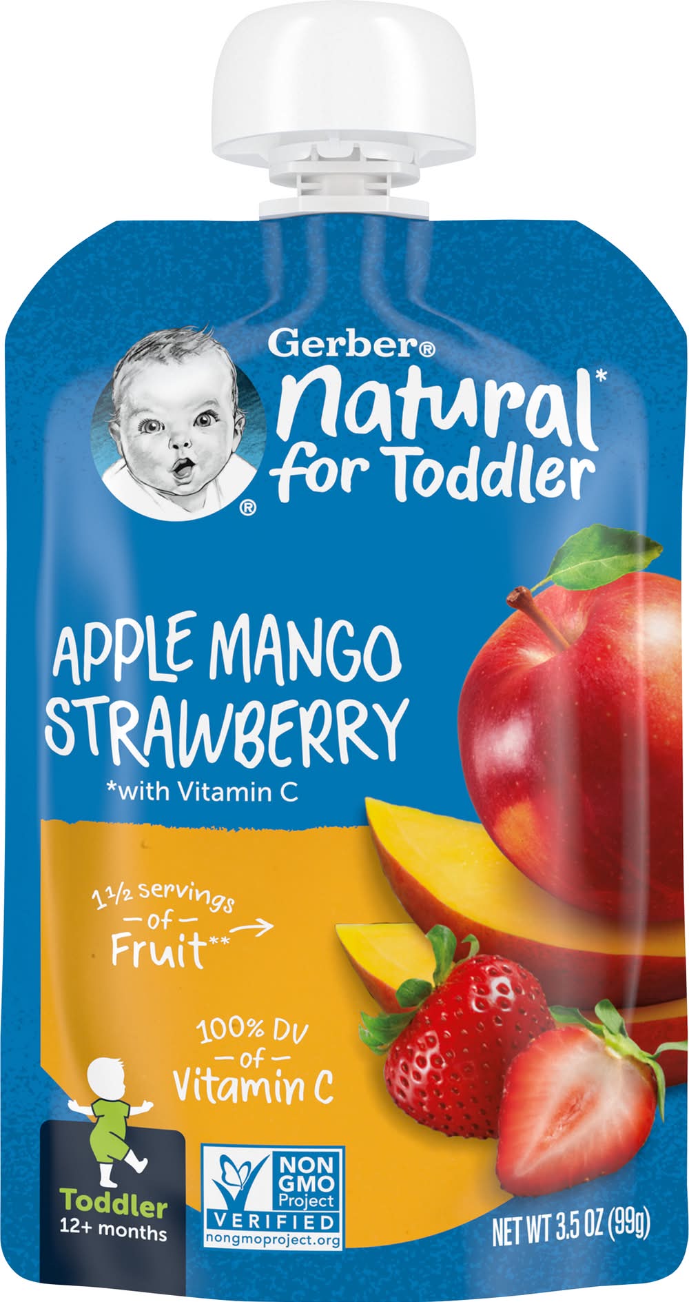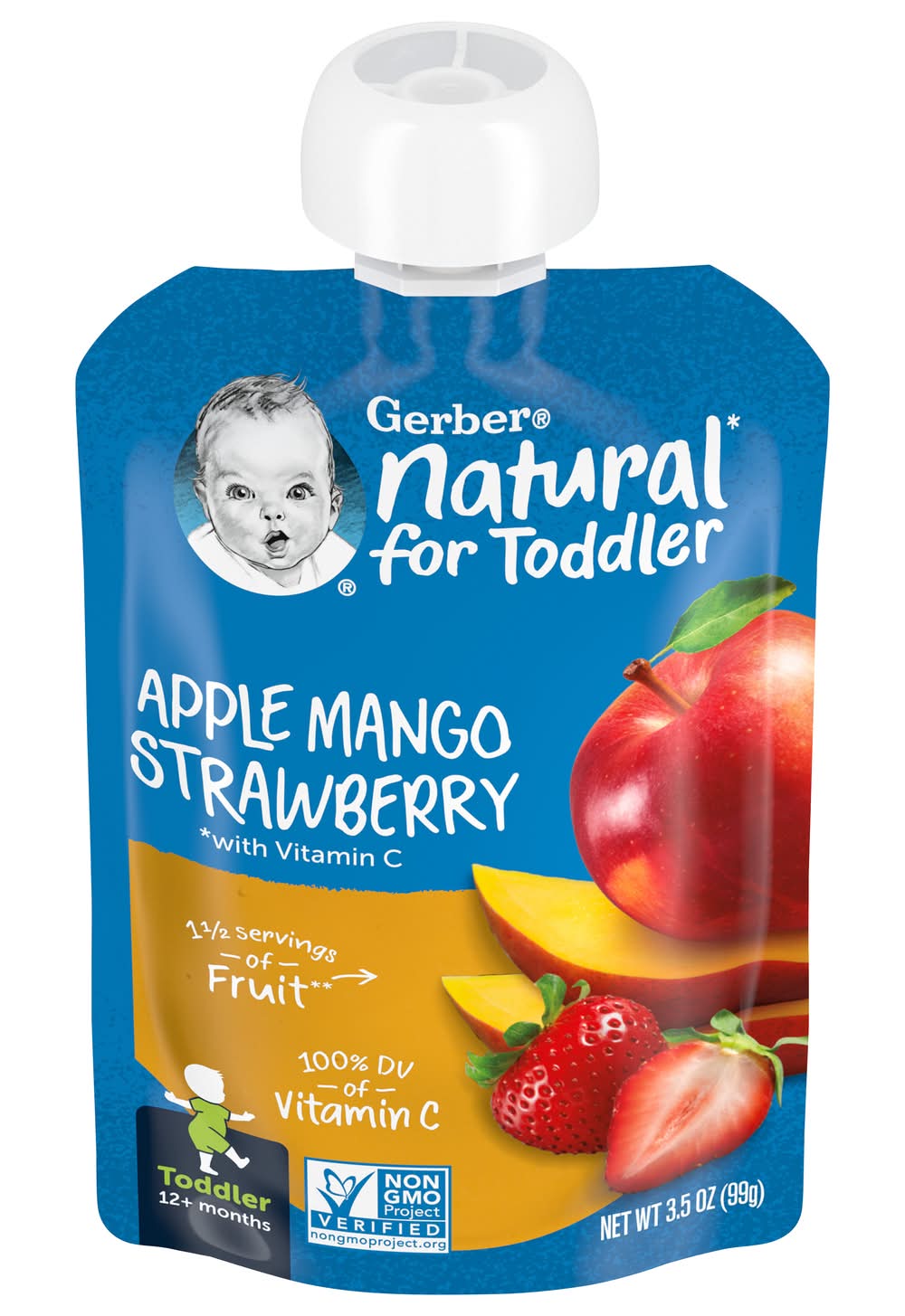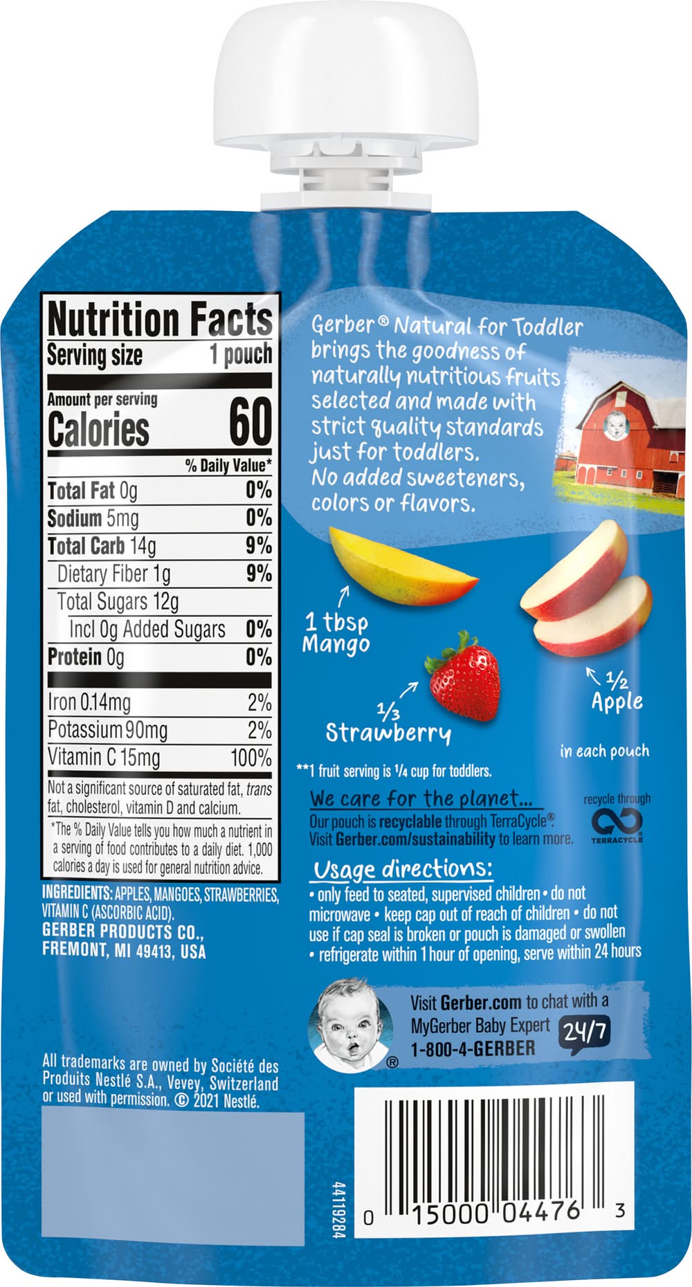 100% DV of Vitamin C. Non-GMO Project verified. nongmoproject.org. 1-1/2 servings of fruit (1 fruit serving is 1/4 cup for toddlers). Gerber Natural for Toddler brings the goodness of naturally nutritious fruits selected and made with strict quality standards just for toddlers. No added sweeteners, colors or flavors. 1 tbsp mango. 1/3 strawberry. 1/2 apple in each pouch. Gerber.com. Visit Gerber.com to chat with a MyGerber Baby Expert 1-800-4-GERBER 24/7. We care for the planet. Our pouch is recyclable through teracycle visit gerber.com/sustainability to learn more. • Gerber Products Co., Fremont, MI 49413 USA • Packaging: Reusable