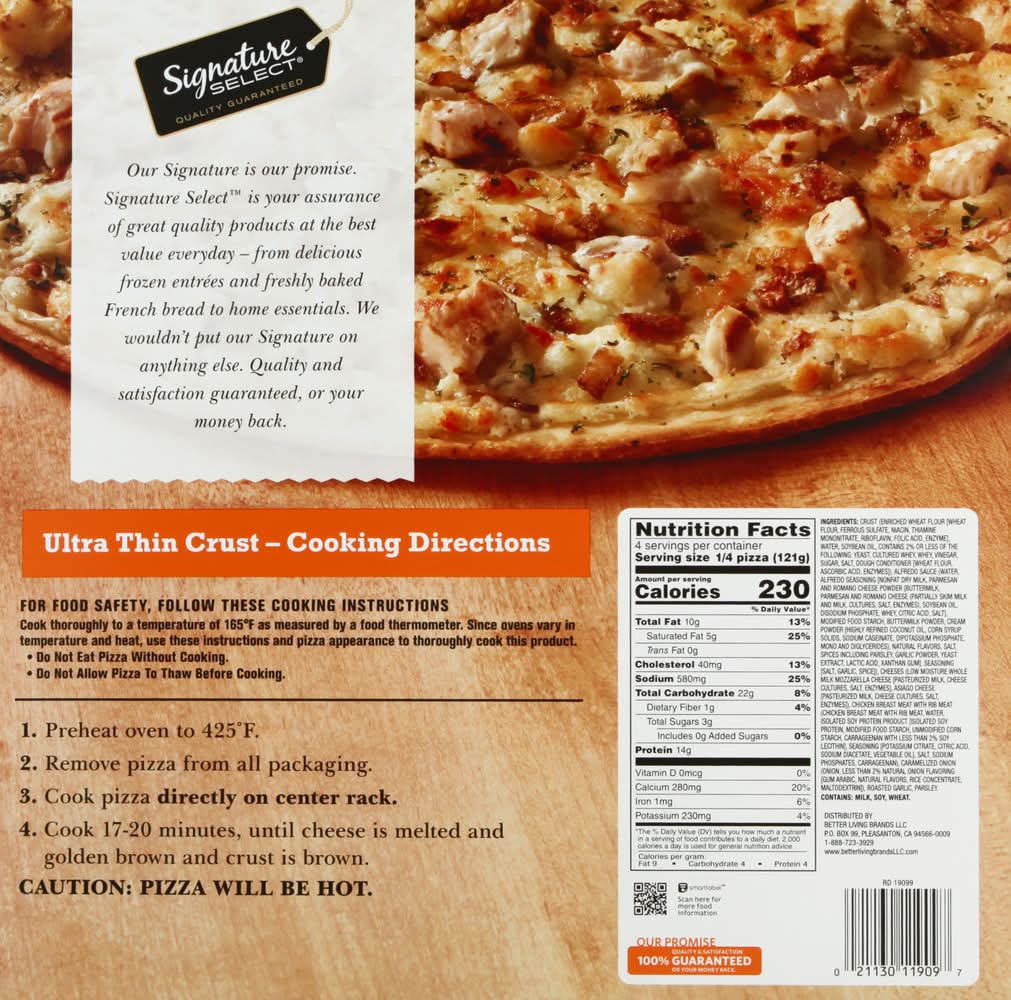 Creamy alfredo sauce topped with mozzarella and asiago cheeses, premium white meat chicken, caramelized onions and roasted garlic. total sugars. Inspected for wholesomeness by US Department of Agriculture. Quality guaranteed. Our Signature is our promise, the best value everyday - from delicious frozen entrees and freshly baked French bread to home essentials. We wouldn't put our Signature on anything else.
