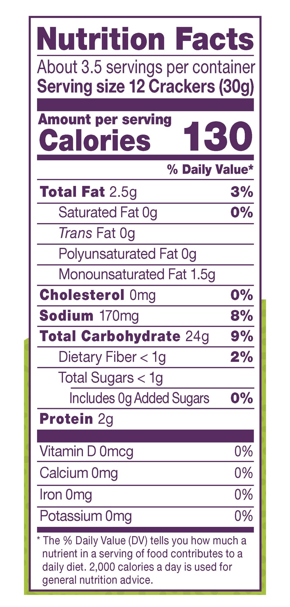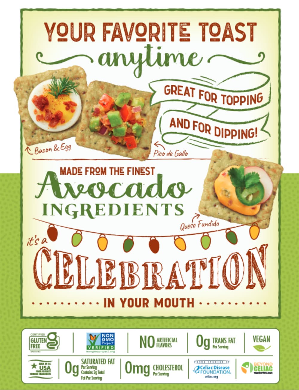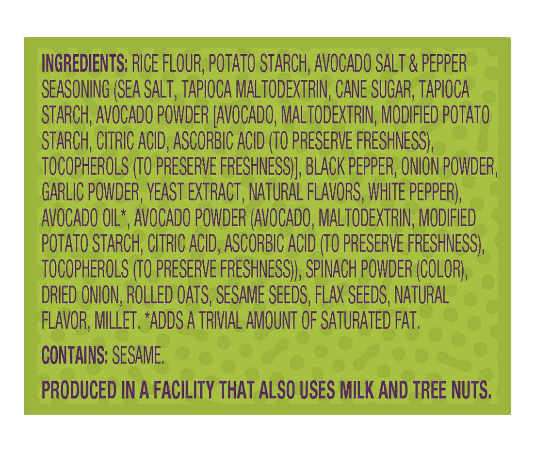 Ingredients: Rice Flour, Potato Starch, Avocado Salt & Pepper Seasoning (Sea Salt, Tapioca Maltodextrin, Cane Sugar, Tapioca Starch, Avocado Powder [Avocado, Maltodextrin, Modified Potato Starch, Citric Acid, Ascorbic Acid (to Preserve Freshness), Tocopherols (to Preserve Freshness)], Black Pepper, Onion Powder, Garlic Powder, Yeast Extract, Natural Flavors, White Pepper), Avocado Oil*, Avocado Powder (Avocado, Maltodextrin, Modified Potato Starch, Citric Acid, Ascorbic Acid (to Preserve Freshness), Tocopherols (to Preserve Freshness)), Spinach Powder (Color), Dried Onion, Rolled Oats, Sesame Seeds, Flax Seeds, Natural Flavor, Millet. * Adds a Trivial Amount of Saturated Fat Contains: Oat, Sesame, Milk, Tree Nuts