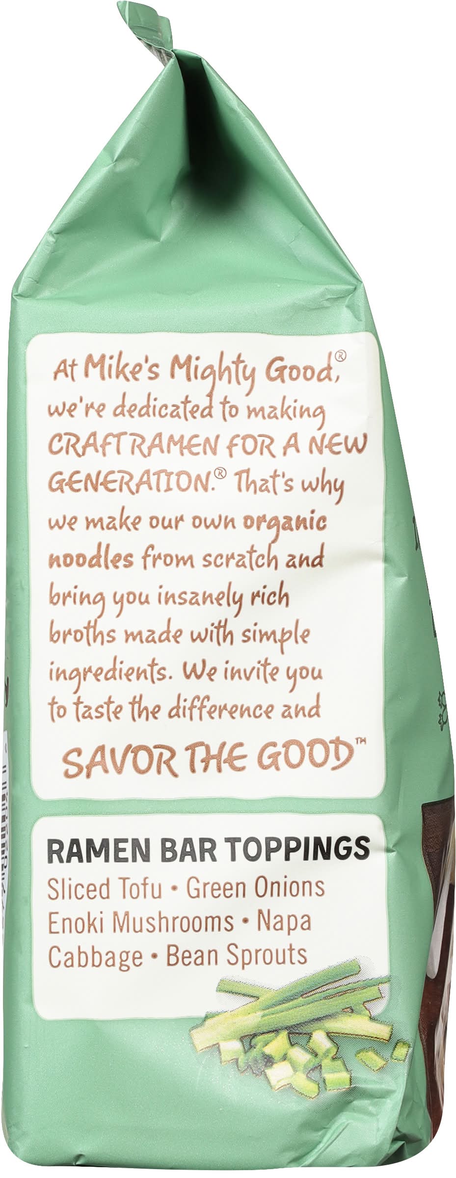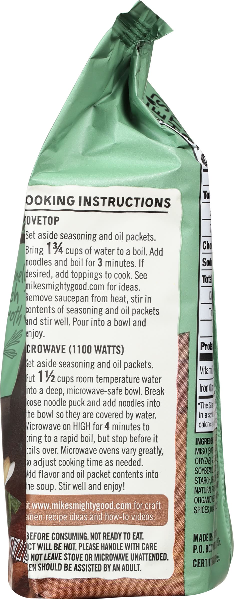 Cooking instructions: stovetop: 1. set aside seasoning and oil packets. 2. bring 1-3/4 cups of water to a boil. add noodles and boil for 3 minutes. if desired, add toppings to cook. see mikesmightygood.com for ideas. 3. remove saucepan from heat, stir in contents of seasoning and oil packets and stir well. pour into a bowl and enjoy. microwave (1100 watts): 1. set aside seasoning and oil packets. 2. put 1-1/2 cups room temperature water into a deep, microwave-safe bowl. break loose noodle puck and add noodles into the bowl so they are covered by water. 3. microwave on high for 4 minutes to bring to a rapid boil, but stop before it boils over. microwave ovens vary greatly, so adjust cooking time as needed. 4. add flavor and oil packet contents into the soup. stir well and enjoy! cook before consuming. not ready to eat. cup & food will be hot. please handle with care & do not leave microwave unattended. children should be assisted by an adult. ramen bar toppings: sliced tofu. green onions. enoki mushrooms. napa cabbage. bean sprouts.