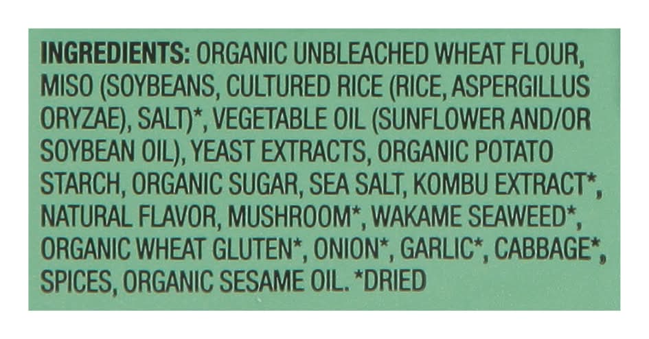Ingredients: Organic Unbleached Wheat Flour, Miso (Soybeans, Cultured Rice (Rice, Aspergillus Oryzae), Salt) (Dried), Vegetable Oil (Sunflower and/or Soybean Oil), Yeast Extracts, Organic Potato Starch, Organic Sugar, Sea Salt, Kombu Extract (Dried), Natural Flavor, Mushroom (Dried), Wakame Seaweed (Dried), Organic Wheat Gluten (Dried), Onion (Dried), Garlic (Dried), Cabbage (Dried), Spices, Organic Sesame Oil Contains: Wheat, Soybeans, Gluten, Sesame