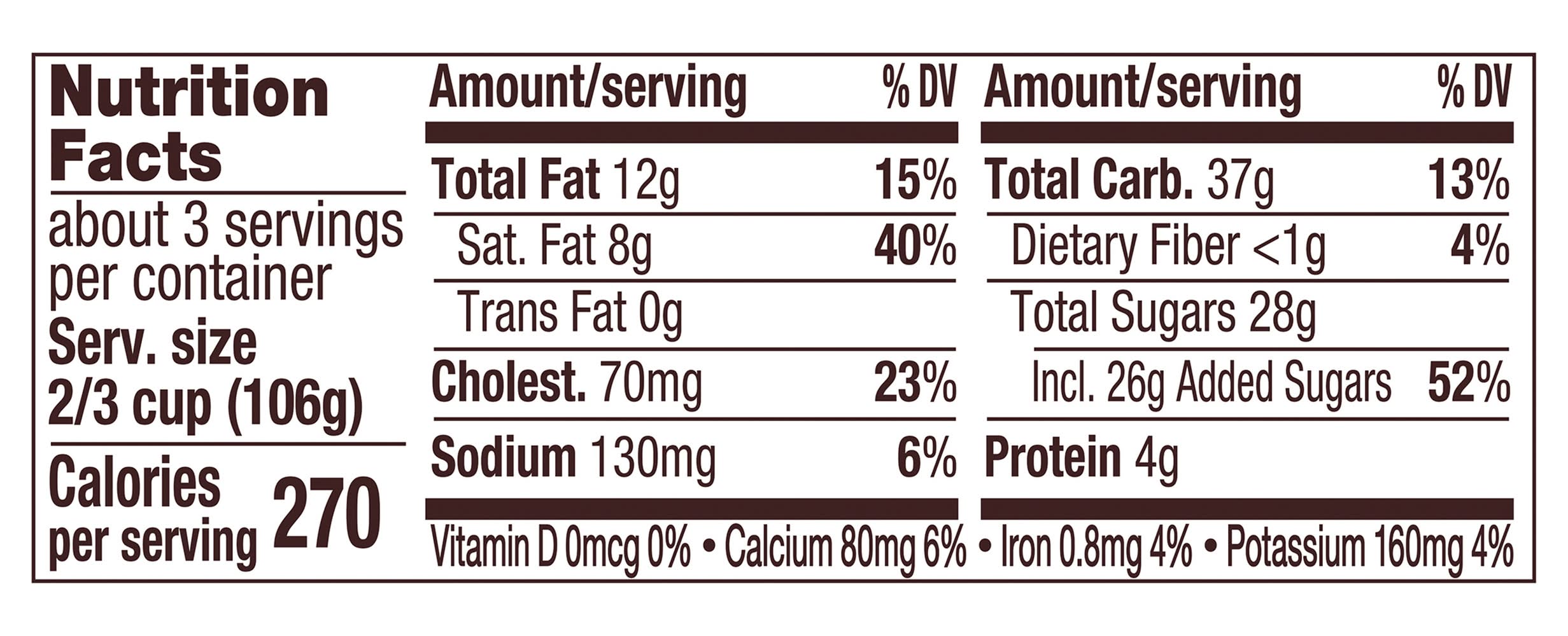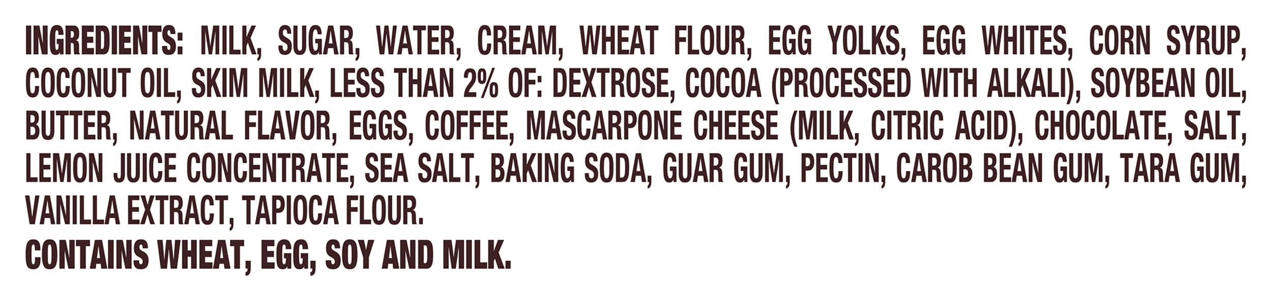 Ingredients: Milk, Sugar, Water, Cream, Wheat Flour, Egg Yolks, Egg Whites, Corn Syrup, Coconut Oil, Skim Milk, Less than 2% of: Dextrose, Cocoa (Processed with Alkali), Soybean Oil, Butter, Natural Flavor, Eggs, Coffee, Mascarpone Cheese (Milk, Citric Acid), Chocolate, Salt, Lemon Juice Concentrate, Sea Salt, Baking Soda, Guar Gum, Pectin, Carob Bean Gum, Tara Gum, Vanilla Extract, Tapioca Flour Contains: Wheat, Eggs, Soybeans, Milk, Corn, Tree Nuts, Coconuts